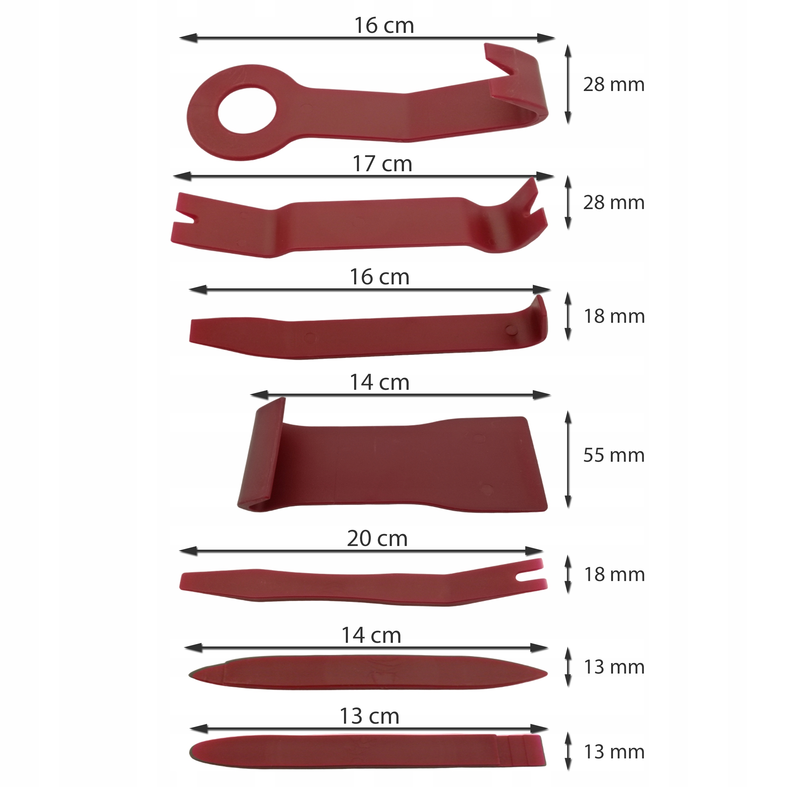 Набор из 7 съемников разной длины и формы + лом 20 см для безопасного снятия обивки, молдингов, дверных обивок и т. д. Особенно рекомендуется для работ в автосервисах, кузовных работах, покраске и автодетализации.