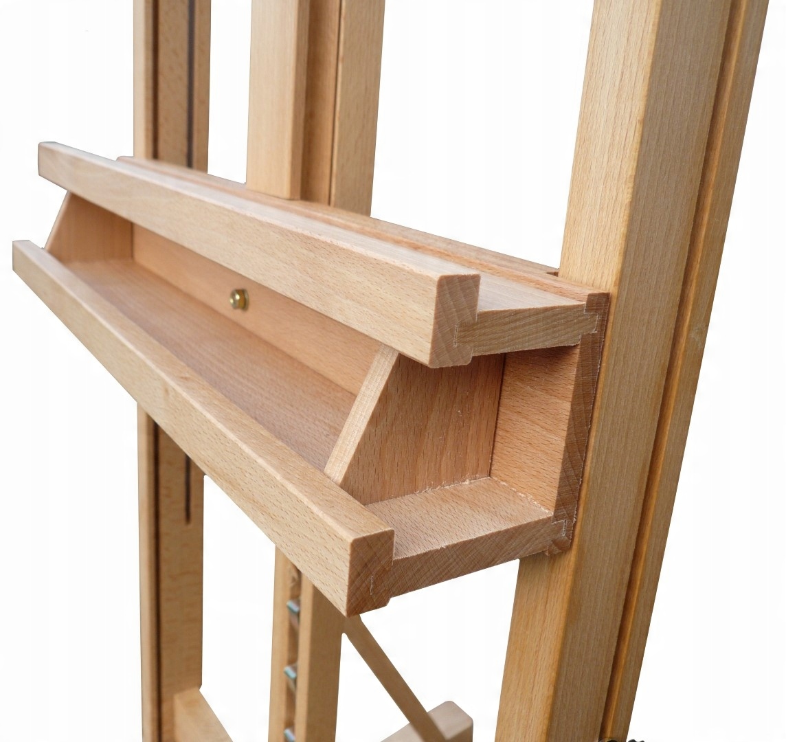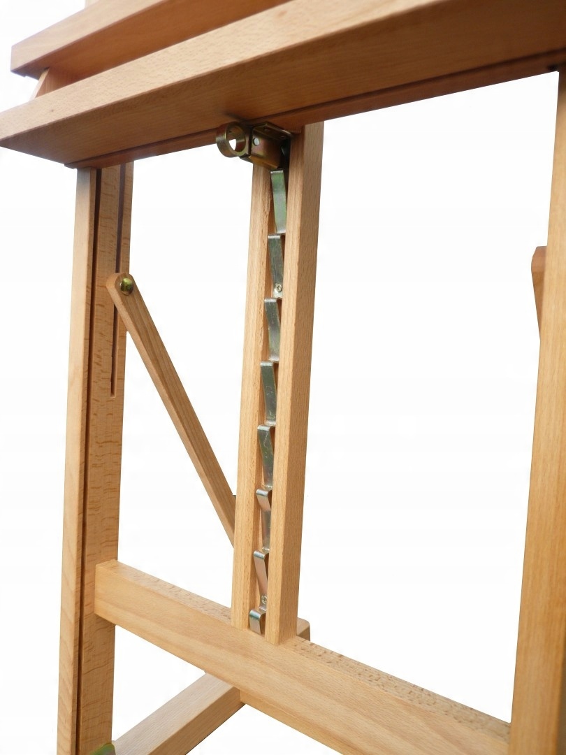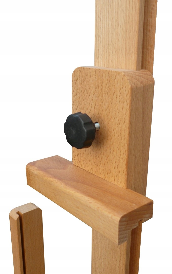 Точная регулировка высоты с помощью системы защелок на планке с металлическим замком и регулируемого угла мольберта обеспечивают оптимальную и стабильную поддержку холста или рамы картины.