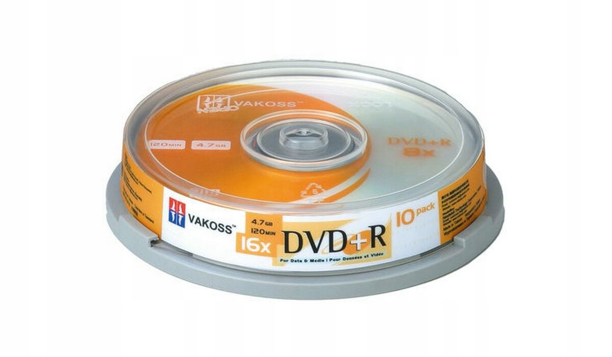 Vakoss ® DVD+R — лучший способ хранения данных. Привод безупречен и долговечен. Отличный выбор для хранения цифровых фильмов, аудио, данных и медиафайлов. Емкость: 4,7 ГБ. Стандартное время воспроизведения: 120 минут, скорость записи до 16 раз. Набор: 10 штук в коробочке для торта.