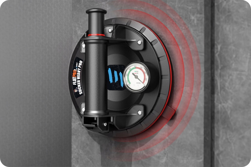 Присоска оснащена манометром-индикатором давления. Индикатор в зеленом поле означает, что создаваемый вакуум высокий и вы можете легко поднимать тяжелые предметы. Когда вы неправильно откачали воздух или он попадает обратно под резину через неровную или грязную поверхность, стрелка будет находиться в красной зоне. Это означает, что существует высокий риск отрыва присоски от поверхности.