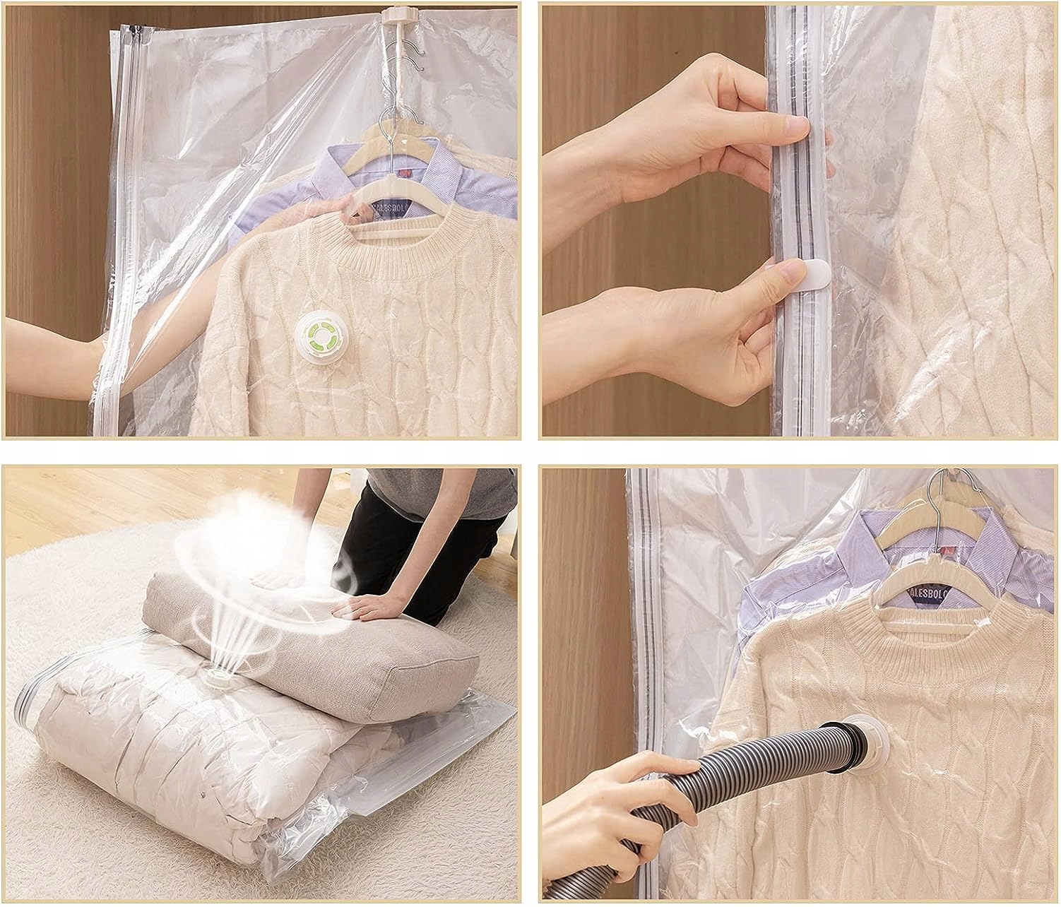 Вы можете легко справиться с сумками для хранения одежды. Просто положите в них текстиль, закройте удобным зажимом, а затем удалите воздух пылесосом.