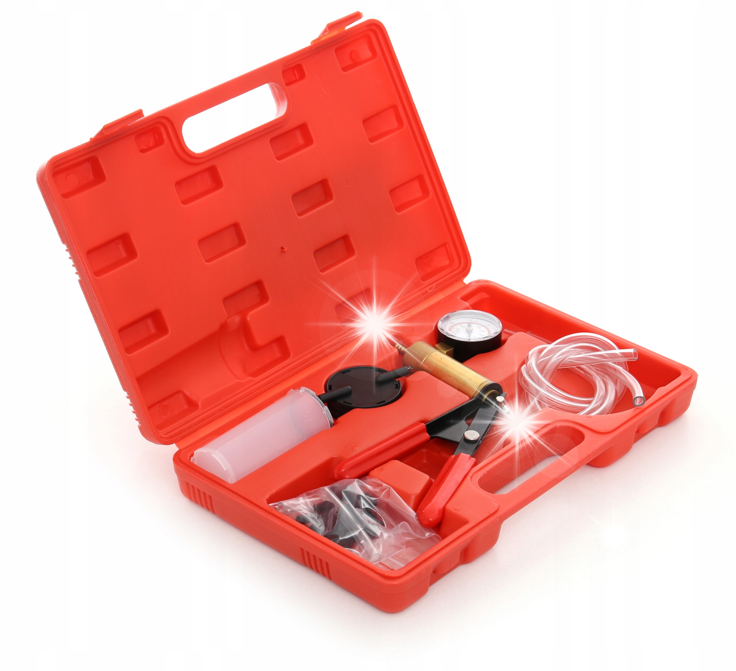 Набор позволяет проверять гидравлические детали автомобиля. Может использоваться для прокачки гидравлических систем или сифона жидкостей. Оснащен встроенным вакуумным манометром.