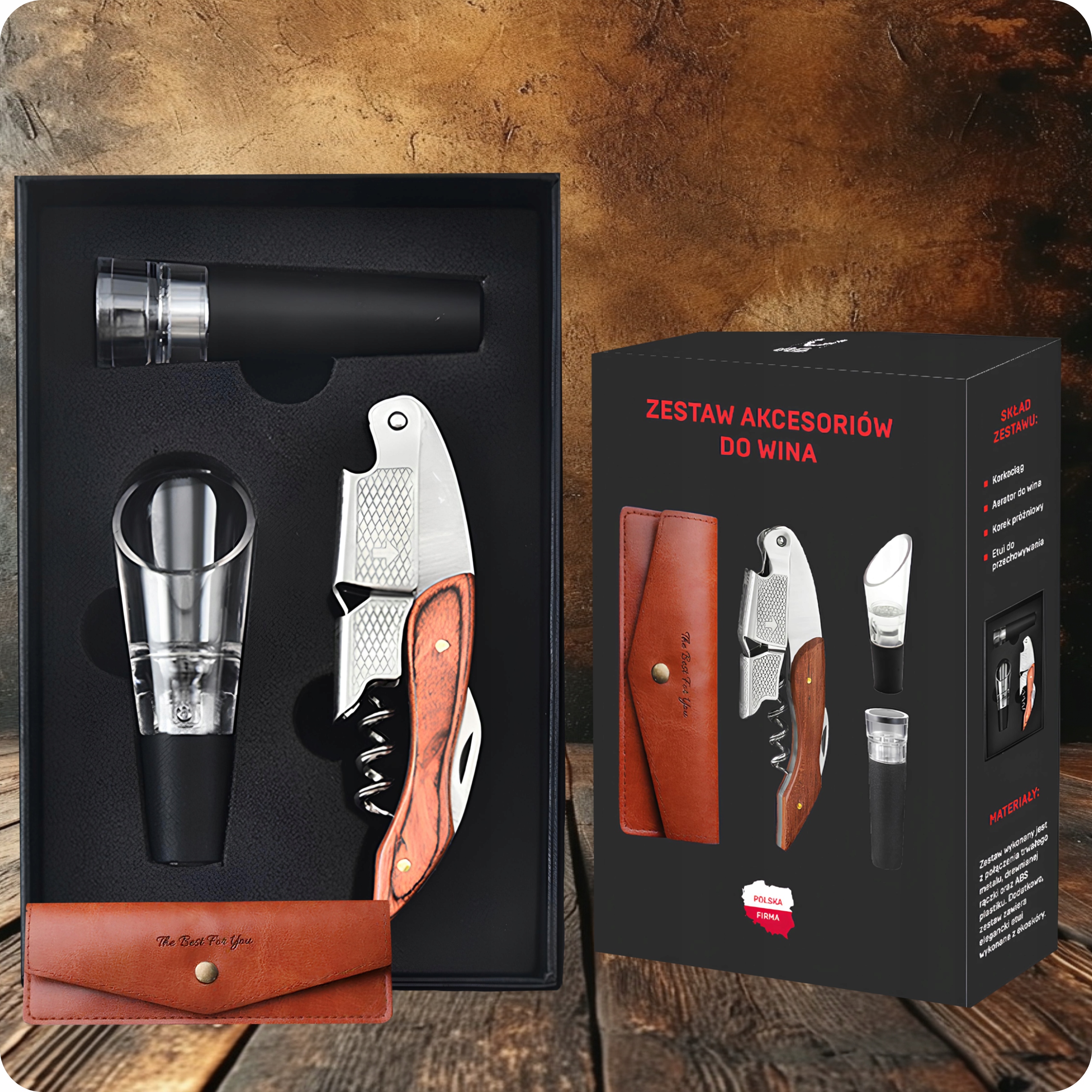 ★ Винный набор бережно упакован в фирменную упаковку которая не только защищает содержимое при транспортировке, но и элегантно выглядит и роскошно. В комплект также входит элегантный чехол из эко-кожи, который идеально подходит для стильного хранения аксессуаров. Все это делает этот набор отличным подарком для каждого любителя вина.