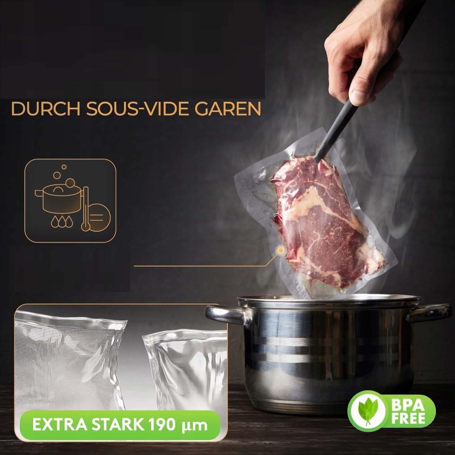 - Простота приготовления блюд — Вакуумные пакеты особенно убедят вас во время деликатного и очень интенсивного вкуса приготовления в режиме Sous Vide: они не содержат BPA и поэтому имеют нейтральный вкус даже в течение многих часов кулинарного опыта. готовлю!