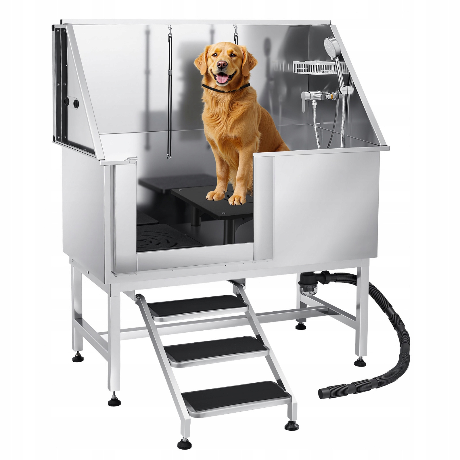 Благодаря цельным сварным швам и встроенным уплотнительным полосам ванна водонепроницаема. Изготовленный из нержавеющей стали, он устойчив к коррозии, долговечен и со временем сохраняет свой новый внешний вид. Ванна имеет гладкие края, что обеспечивает безопасность животных и пользователей во время купания.