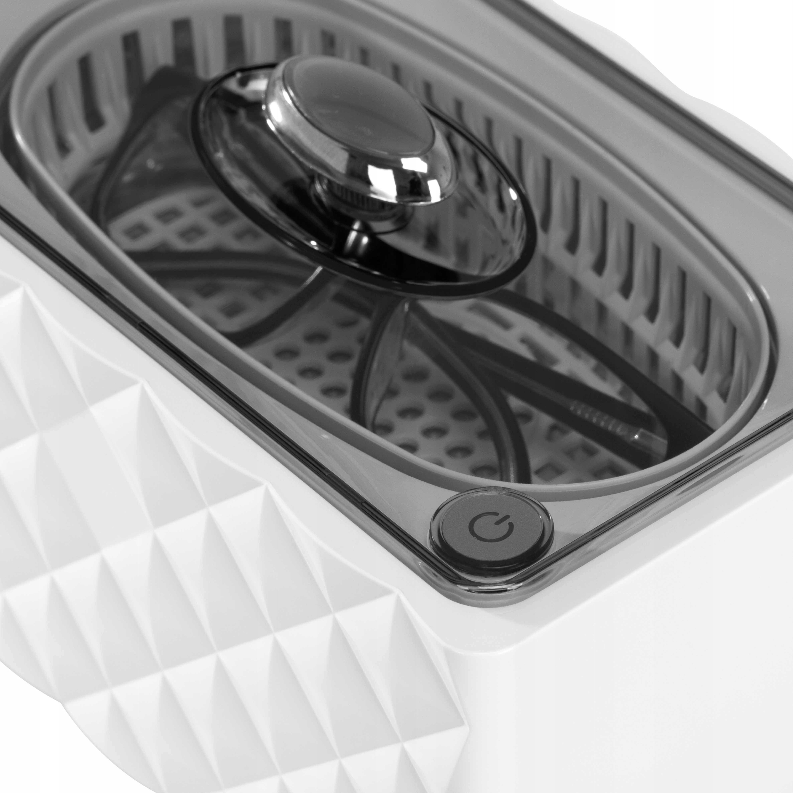 Небольшие габариты делают этот ультразвуковой очиститель очень удобным для транспортировки, и он не занимает слишком много места в гостиной. Эстетичный, декорированный корпус выполнен из черного пластика, а прозрачная крышка позволяет следить за процессом и не затрудняет включение устройства, хоть кнопка и спрятана под ним. Внутри контейнера имеется маркировка максимального наполнения жидкостью (до 300 мл). Устойчивость устройства обеспечивают нескользящие ножки.