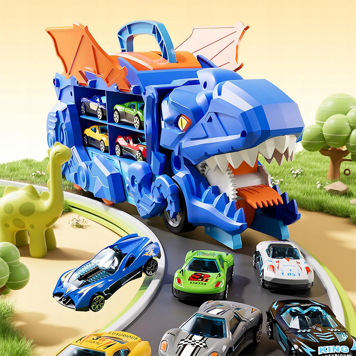 ⭐БОЛЬШЕ РАЗВЛЕЧЕНИЯ: благодаря открывающейся конструкции днища грузовика все 12 автомобилей могут задвигаться и выдвигаться. Долгосрочное участие, тренировка зрительно-моторной координации и обучение игре с динозаврами. Эта переноска с динозавром – идеальный подарок.