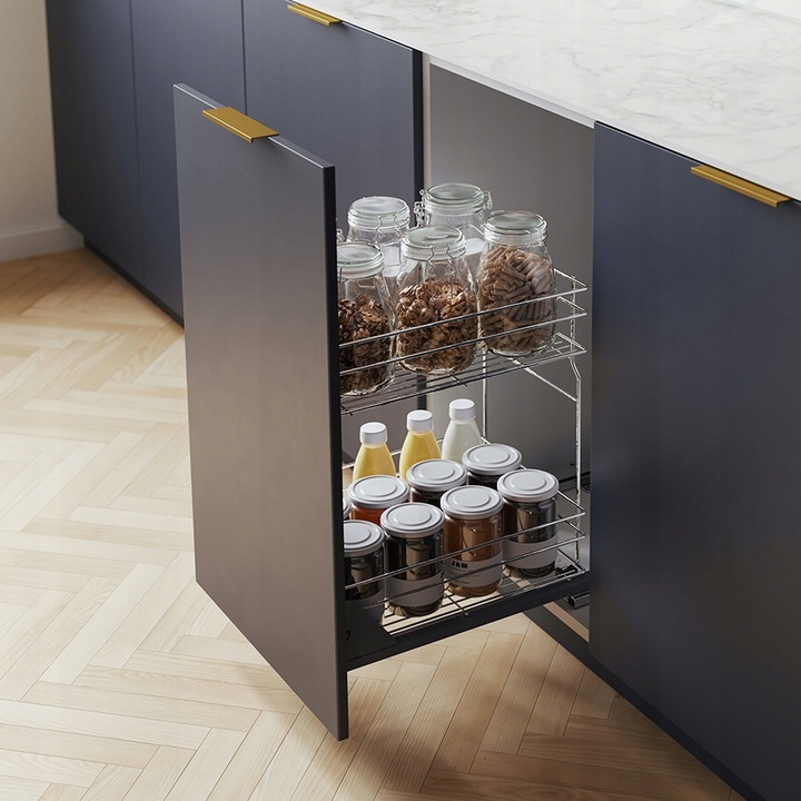 Недовелый груз предназначен для кухонных шкафов не более 300 мм. Груз оснащен полной круизной системой. Самопроизводство с тормозом гарантирует тихое закрытие, а полная скольжения обеспечивает легкий доступ к содержимому шкафа. Груз изготовлен из проволоки и оцинкованной, благодаря тому, что он создает впечатление хрома, гиды - серебряные.