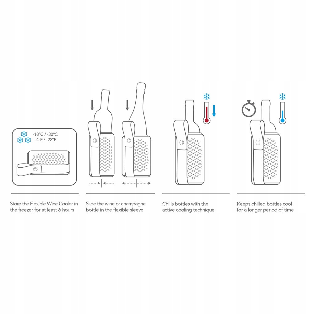 хранить винный кулер в морозильной камере в течение как минимум 6 часов . Вставьте бутылку вина или шампанского в рукав, элементы охлаждения мороженого имеют прямой контакт с бутылкой, обеспечивая оптимальный эффект охлаждения.