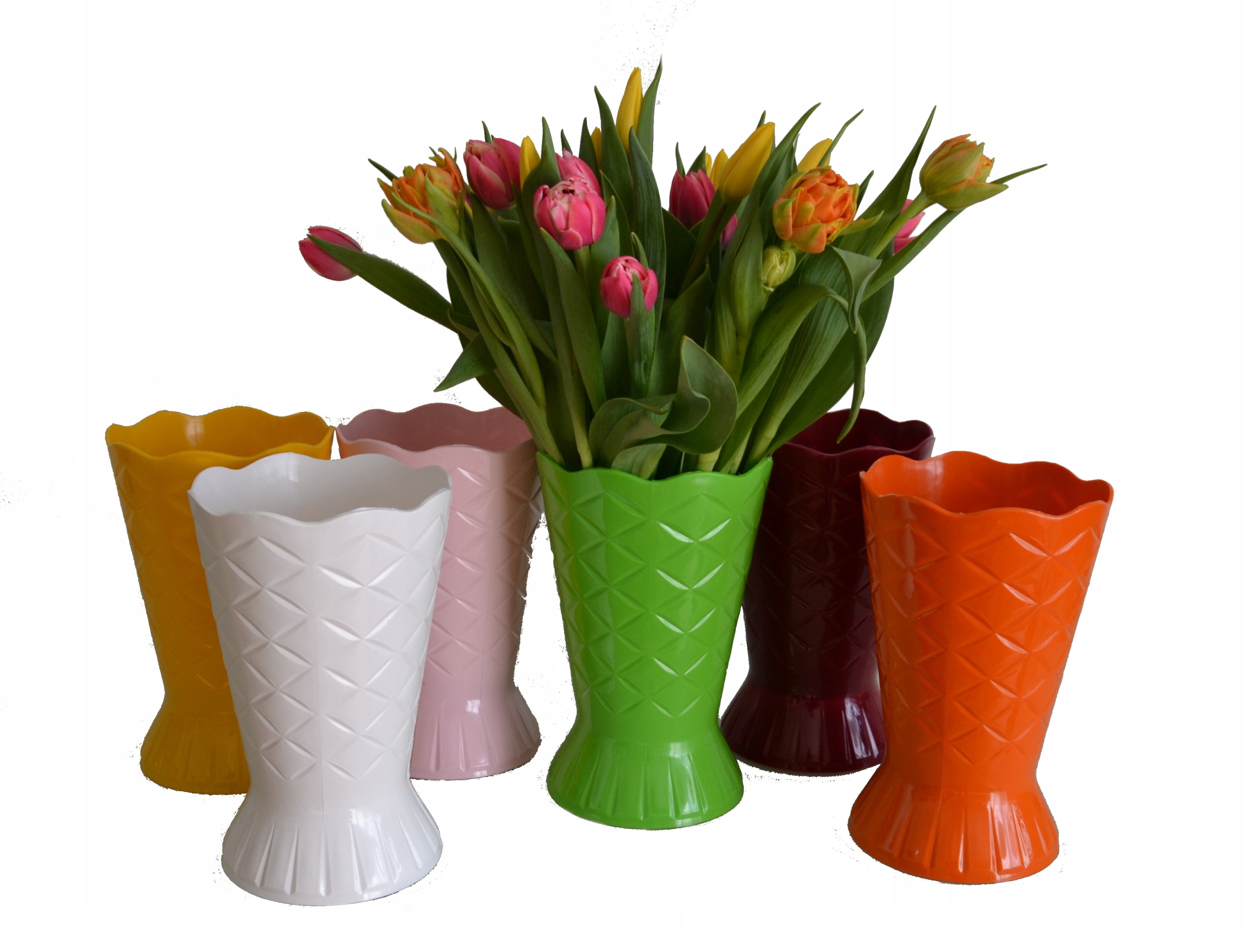 Пластиковая ваза цельная, высотой 23 см, диаметром верха 15 см.