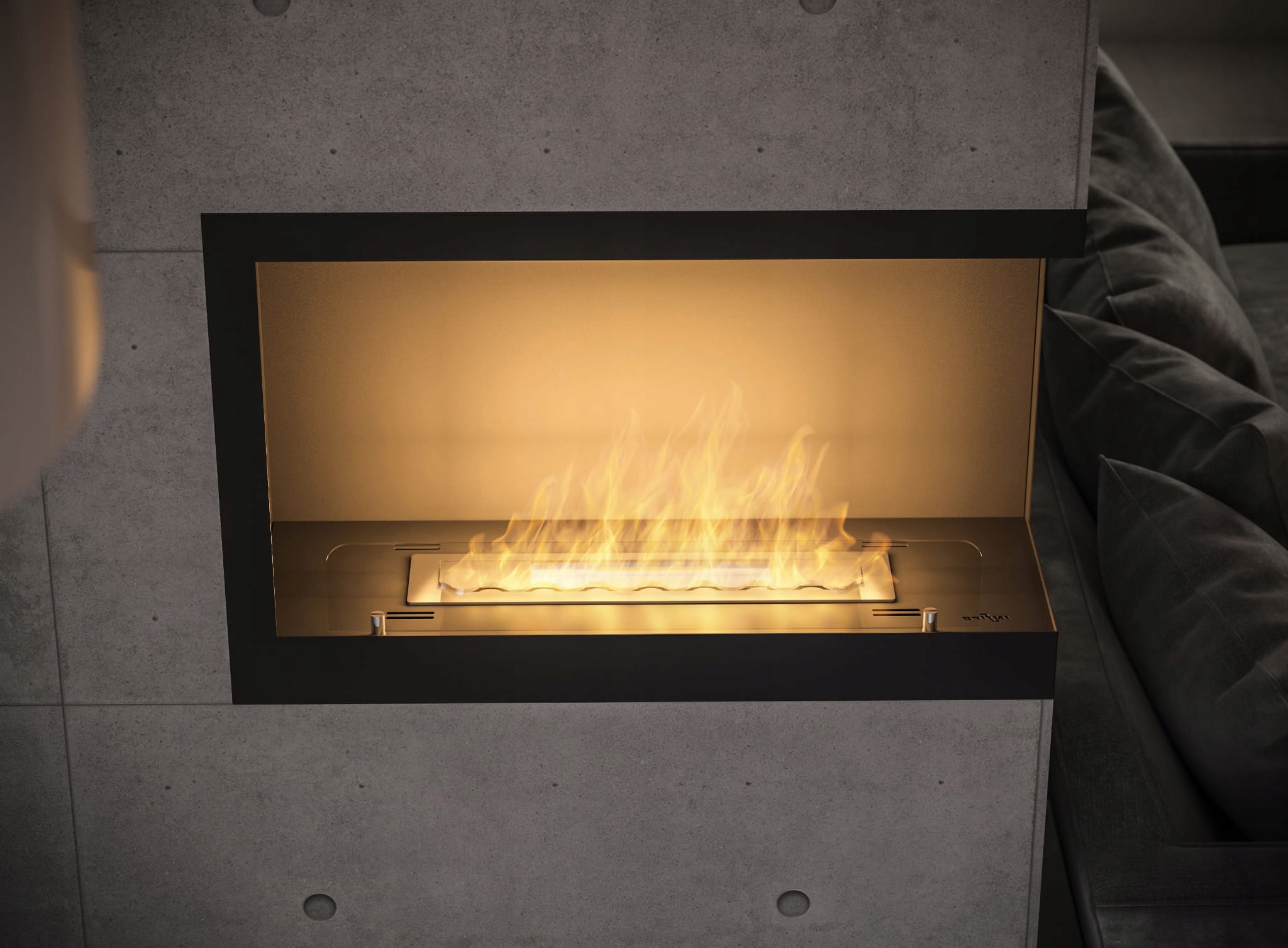 INFIRE INSIDE P800 Vers1 — угловой биокамин с обзором огня спереди и справа. Его конструкция позволяет легко установить его на стену, поскольку внешние рамы закрывают дефекты вырезанного отверстия. Простой и нежный дизайн камина хорошо впишется в любой интерьер, а также станет прекрасным фоном для домашнего камина. Слегка тонированное стекло стабилизирует огонь и придает ему неповторимый вид.