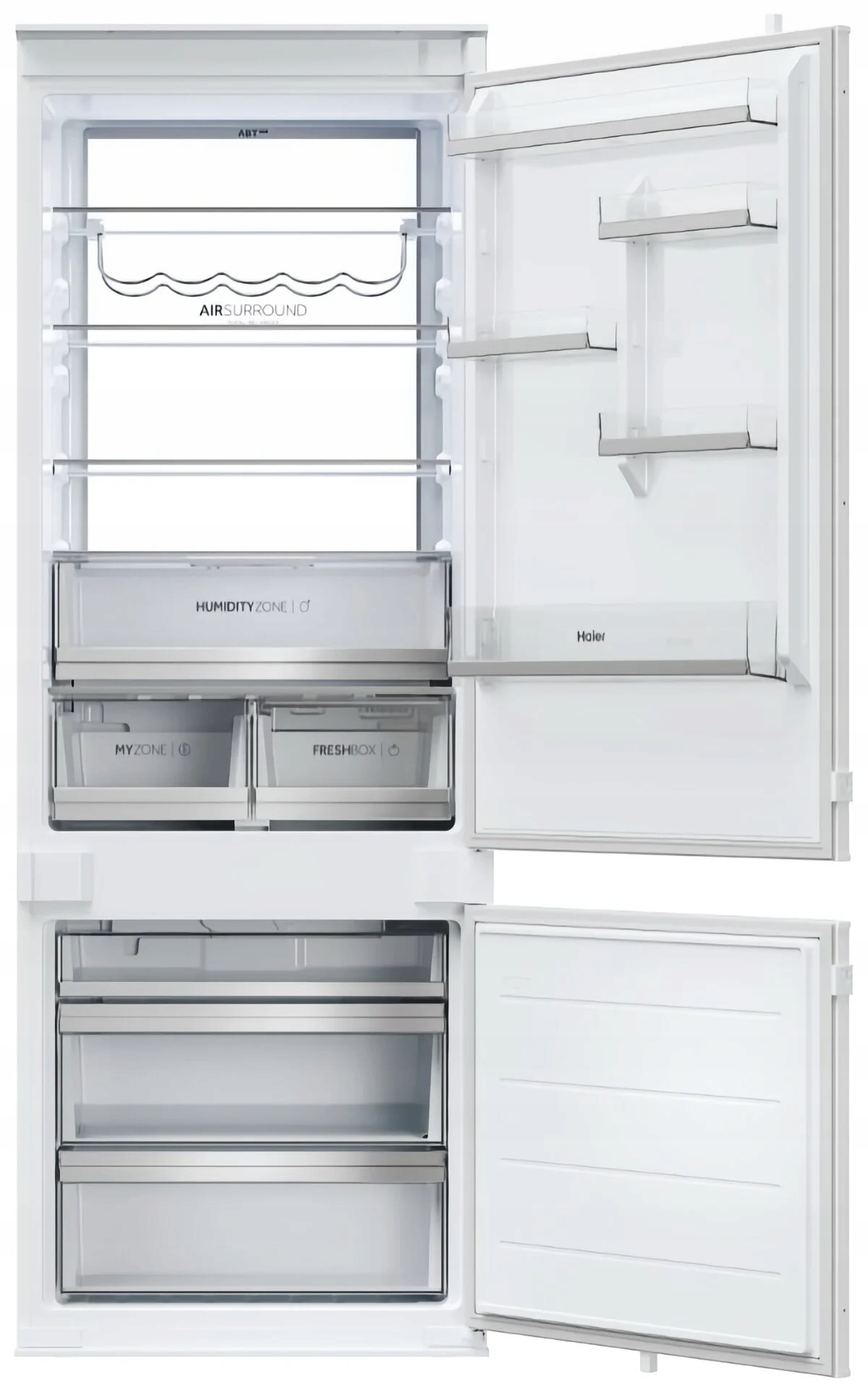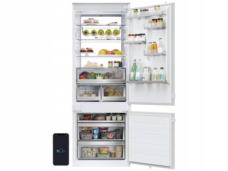 Встраиваемый холодильник Haier HBW7719DT — это устройство высотой 193,5 см и общей емкостью 400 литров — 285 литров в холодильнике и 115 литров в морозильной камере. Благодаря полной технологии No Frost исключается необходимость размораживания, а заднее светодиодное освещение обеспечивает отличную обзорность салона. Специальные зоны, такие как «Моя зона» с контролем температуры и «Влажная зона», поддерживающая влажность, помогают дольше сохранять свежесть продуктов. Кроме того, тихая работа в 33 дБ и энергоэффективность класса D делают его практичным выбором для каждой кухни.