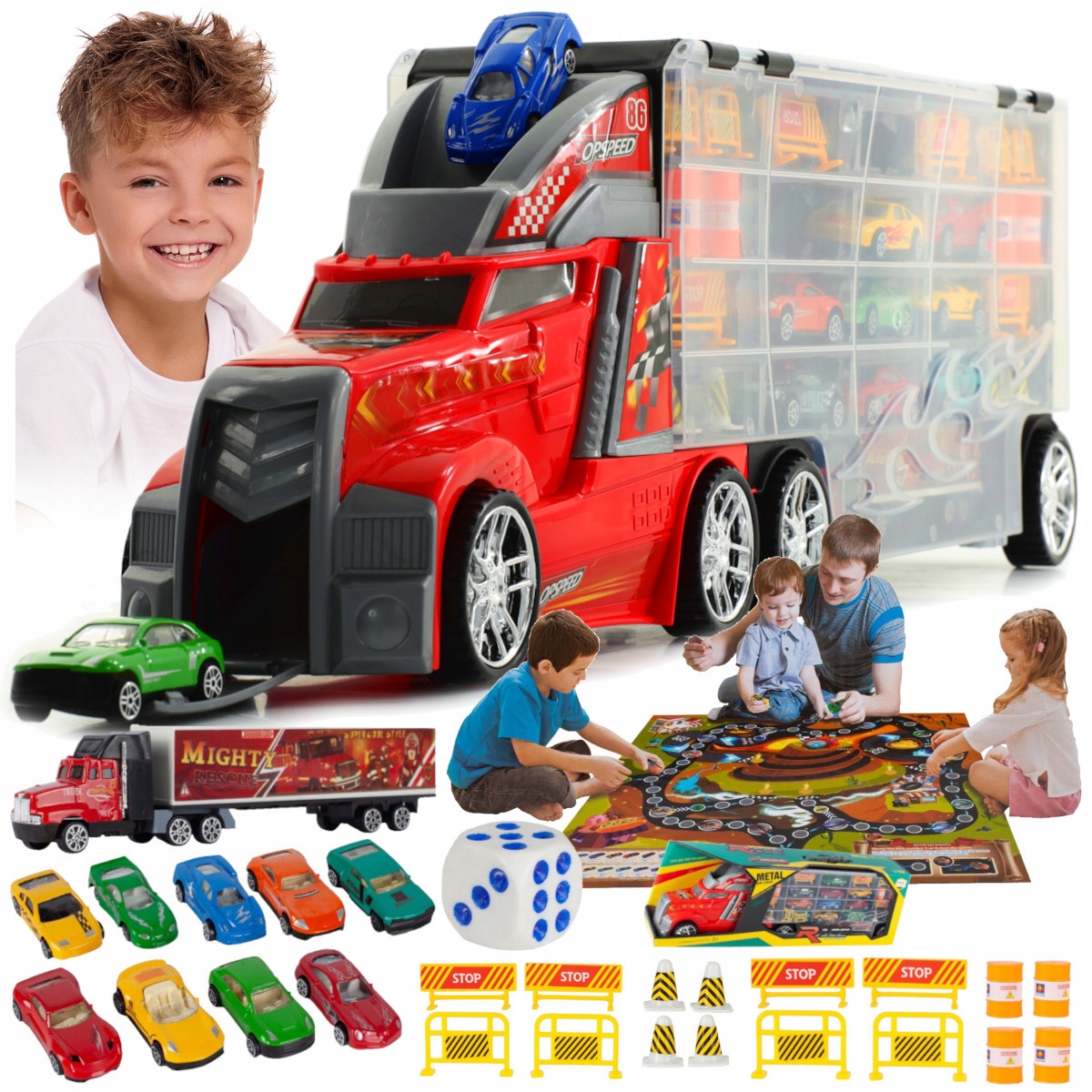 ОГРОМНЫЙ АВТОМОБИЛЬ ЭВАКУАТОР 63 СМ С ЛАунчером + 11 МАШИН + НАСТОЛЬНАЯ ИГРА