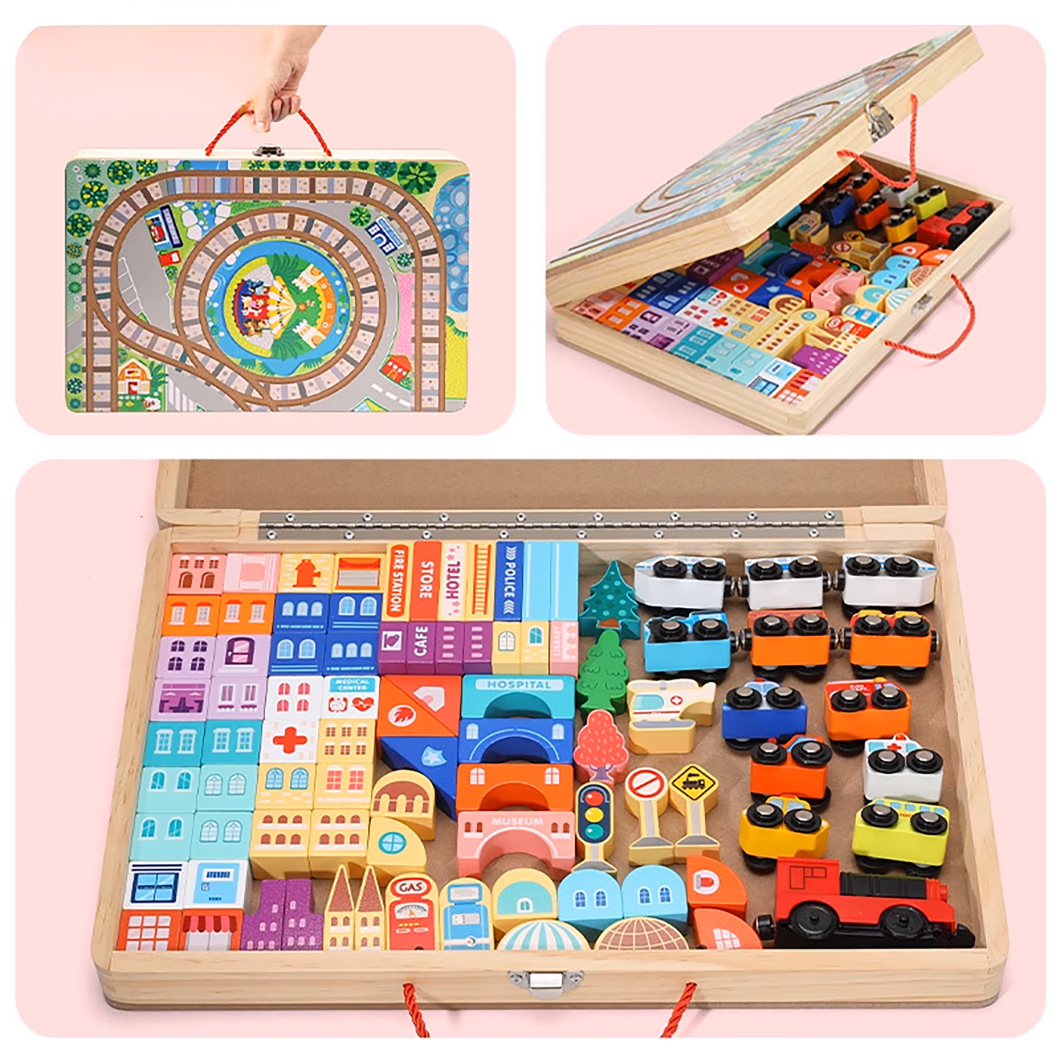 ➡️ОГРОМНЫЕ ДЕРЕВЯННЫЕ ЭЛЕКТРОЖЕЛЕЗНОДОРОЖНЫЕ ПУТИ + НАБОР ГОРОДСКИХ БЛОКОВ В ЧЕМОДАНЕ