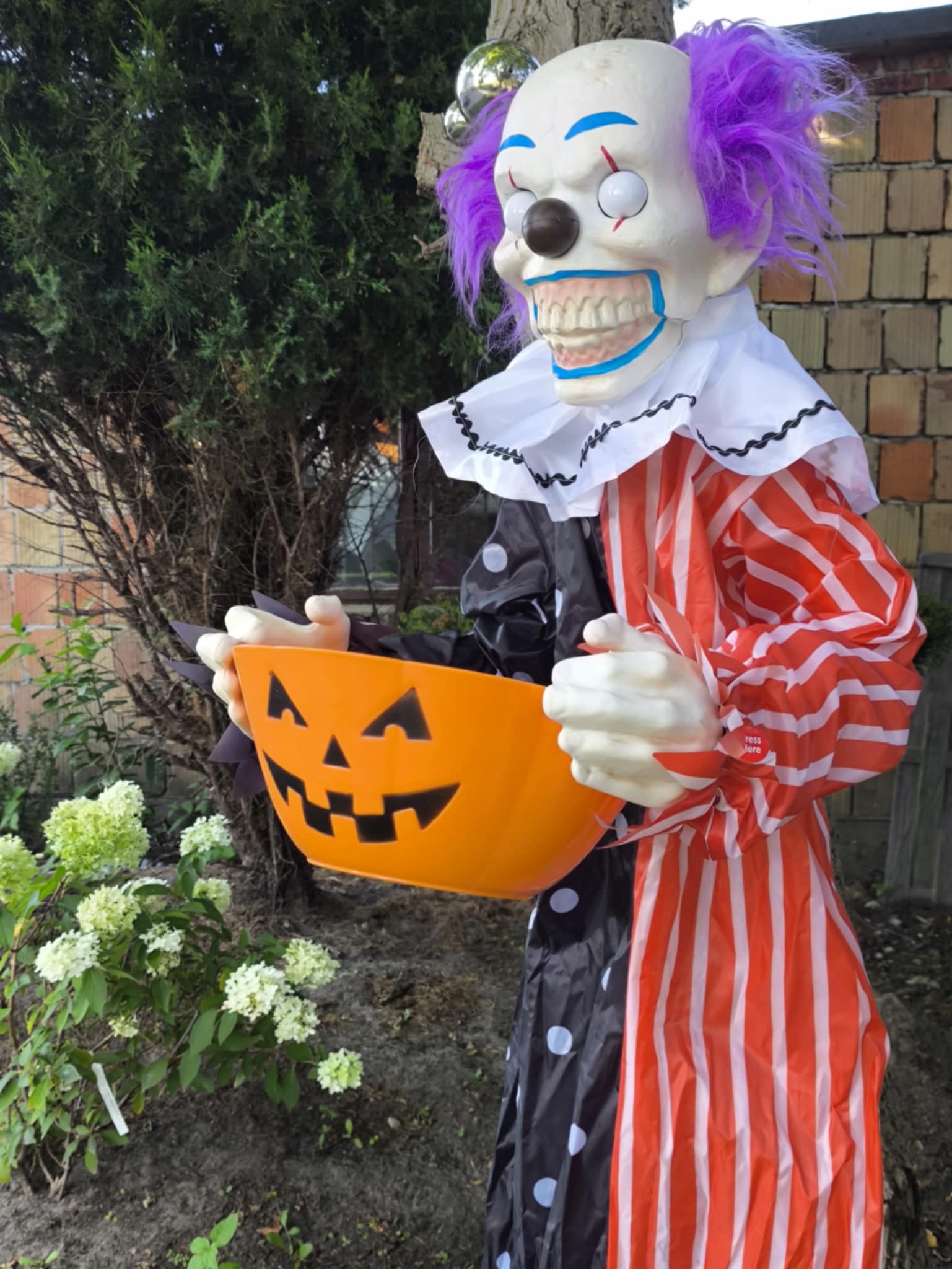 Удивите своих гостей и создайте по -настоящему темную атмосферу Хэллоуина благодаря этой уникальной фигуре призрачного клоуна. Фигура одет в черный и красный пояс и горох, с характерным белым воротником и фиолетовыми волосами, держащей оранжевую миску из тыквы в их идеи для конфет для посетителей.