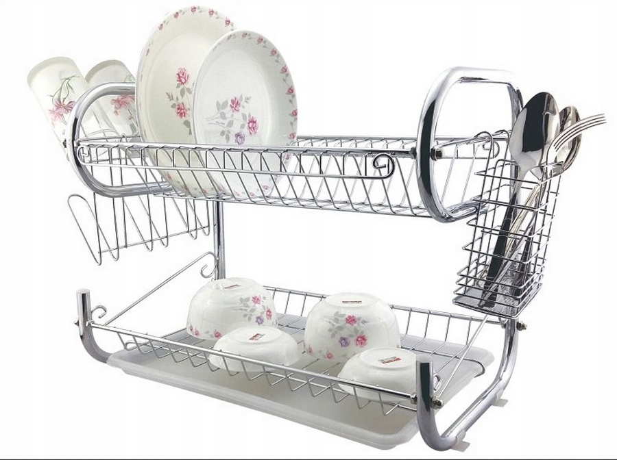 На верхнем уровне помещается до 17 тарелок, а на нижнем – сушка мисок, чашек, кастрюль и т. д. Изделие очень прочное и долговечное, благодаря конструкции из хромированного металла.