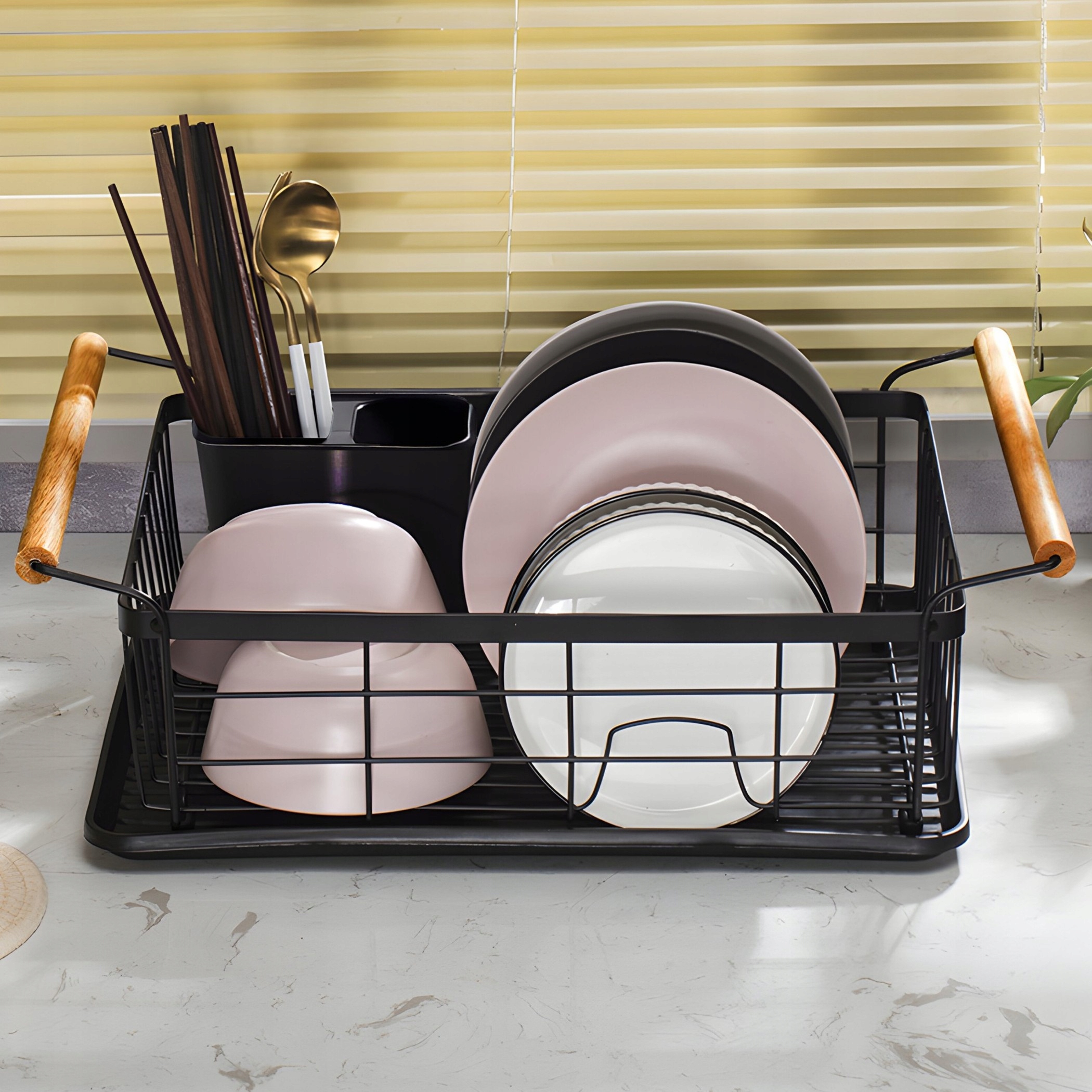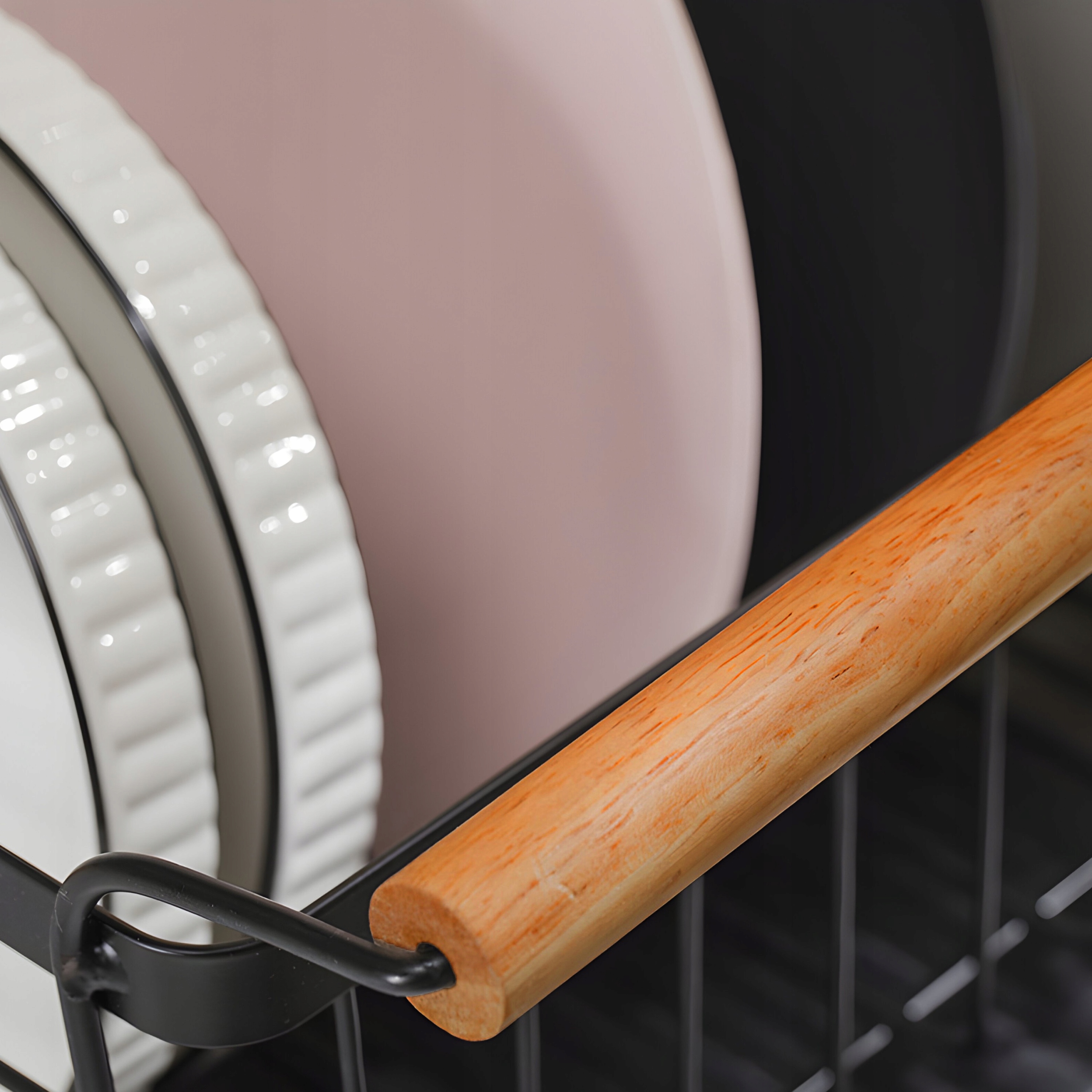 Сушилка оснащена поддоном, контейнером для столовых приборов и элегантными деревянными ручками.