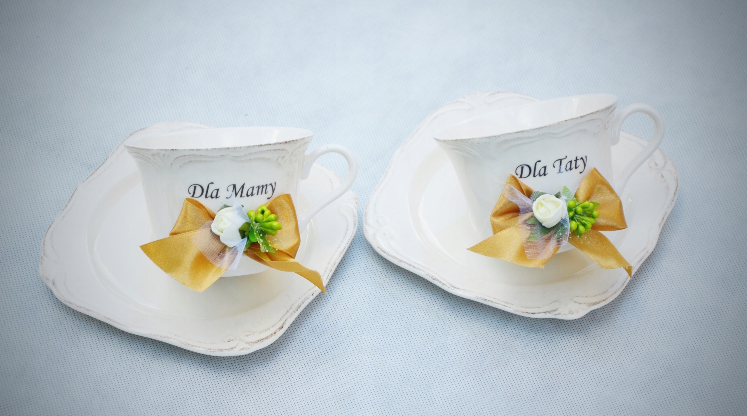 - комплектфарфоровые чашки от Manufaktura Chodzieska емкостью 250 мл с надписью ручной работы: «Папе»,Для мамы» с блюдцами диаметром 16 см (подставки при транспортировке подкладываются под полотенца),