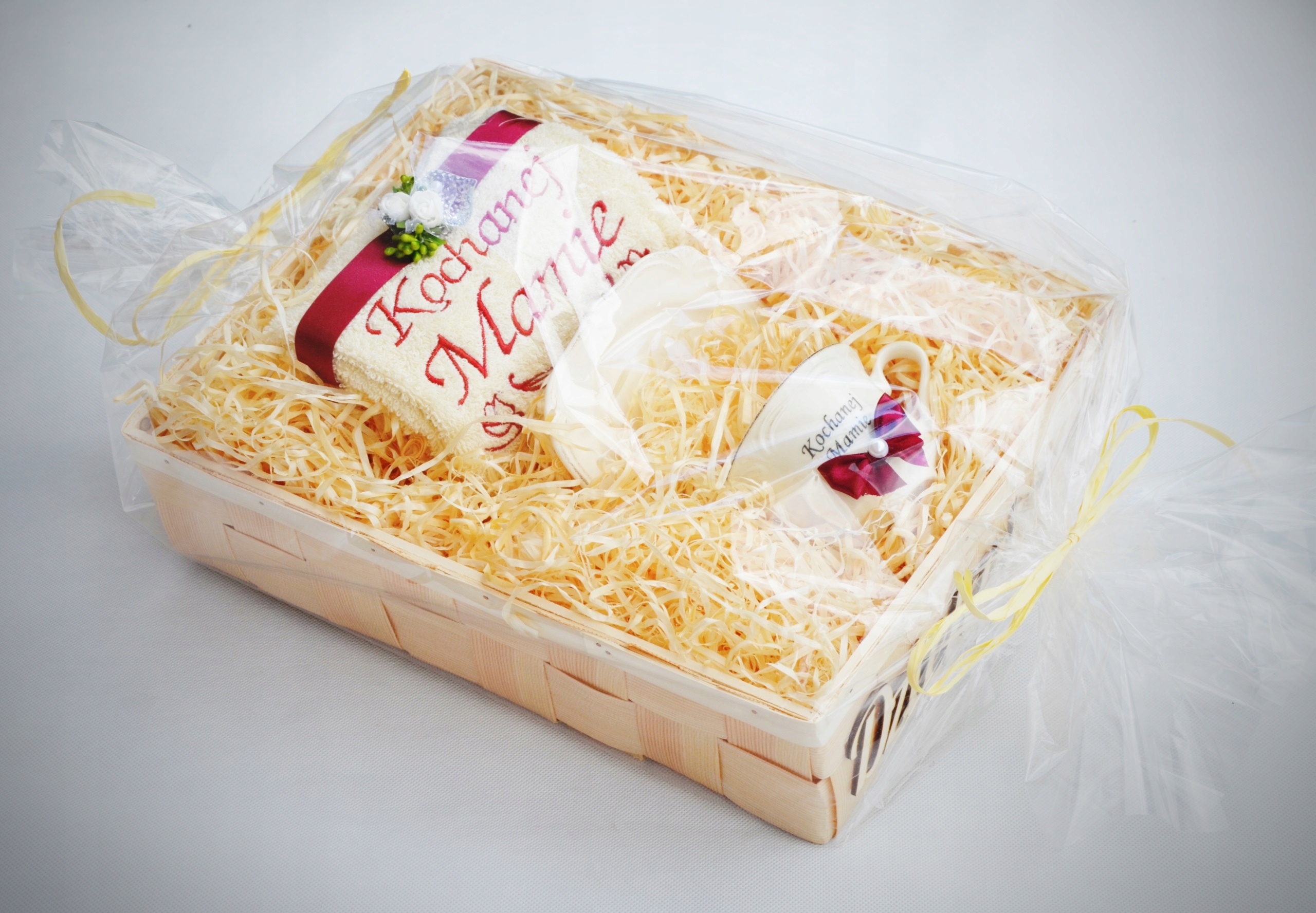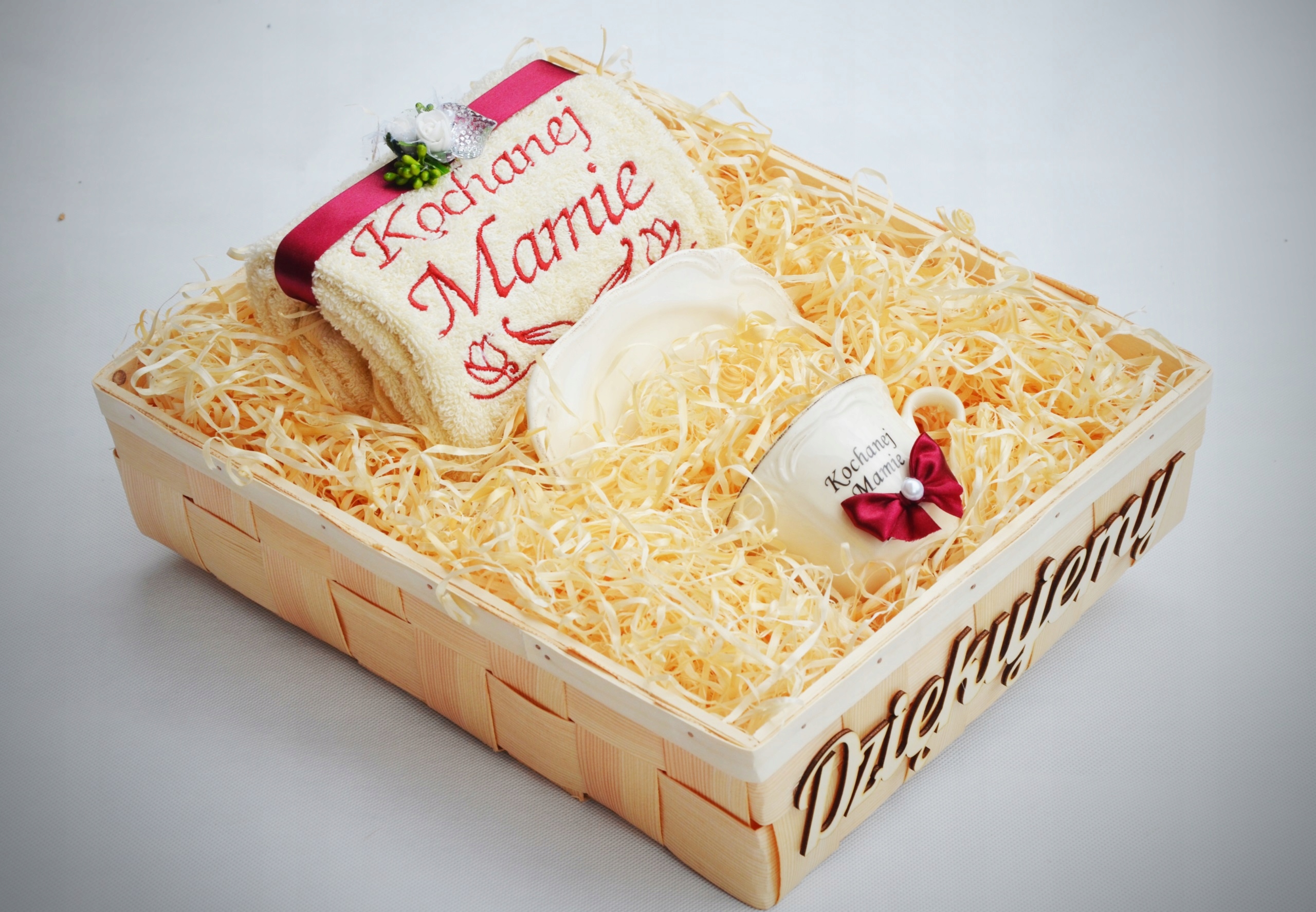 - украшение на полотенце и чашке, выполненное квалифицированными флористами с использованием флористических аксессуаров высочайшего качества,