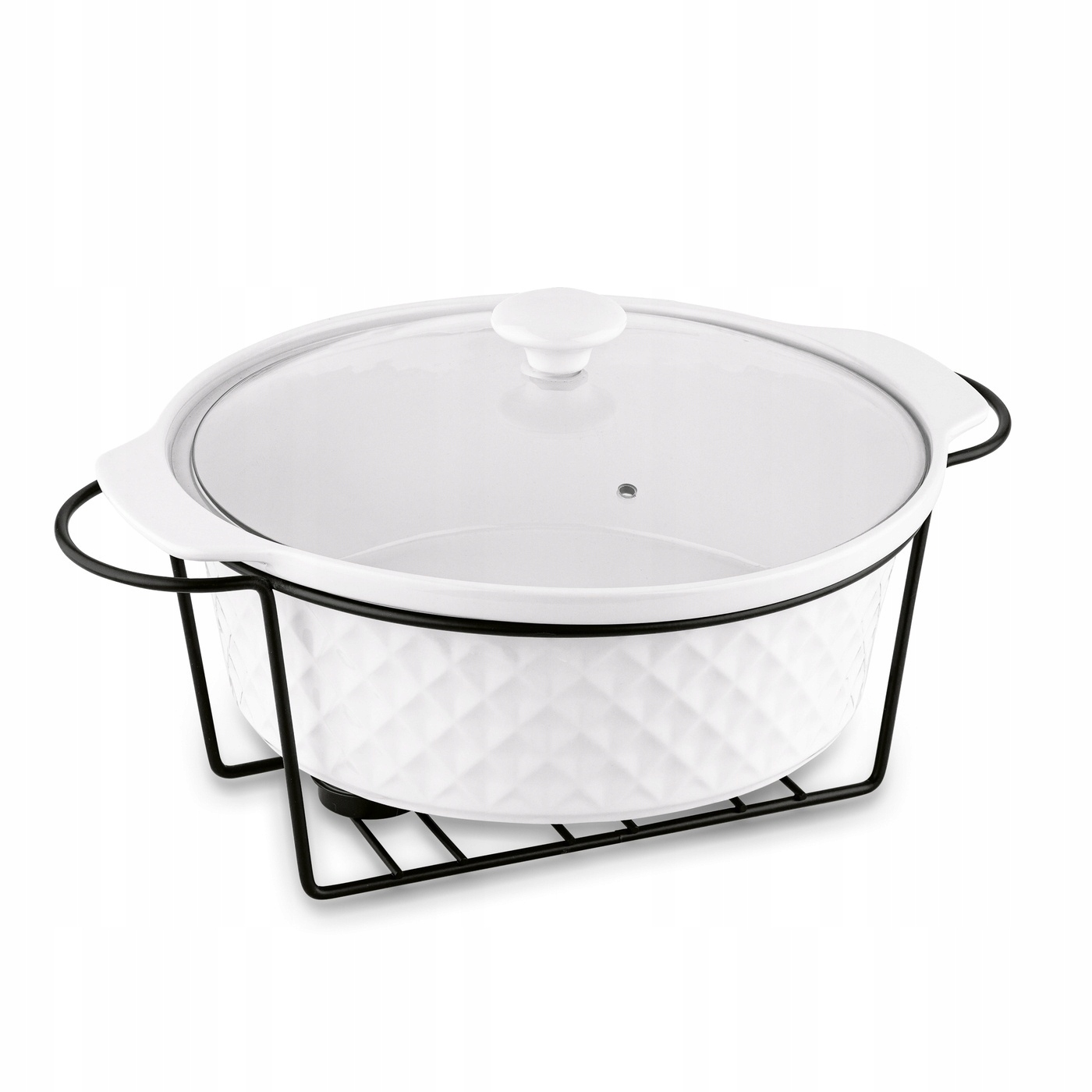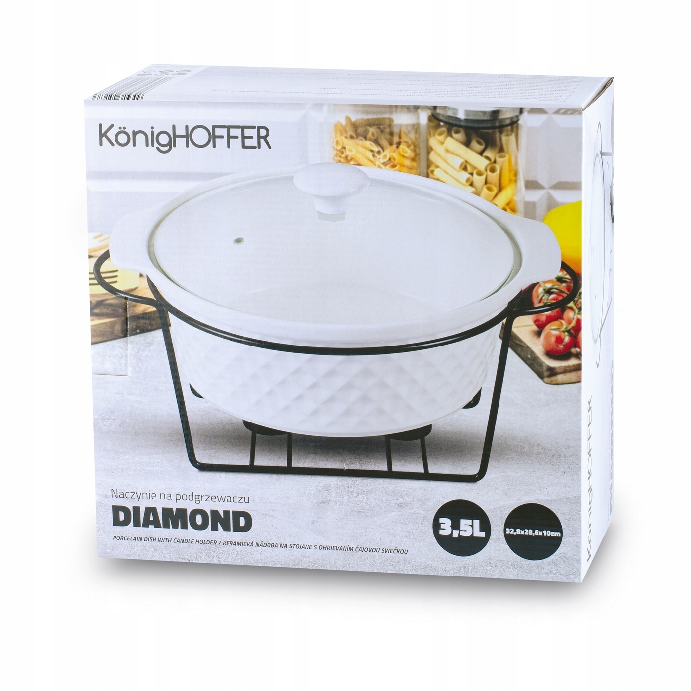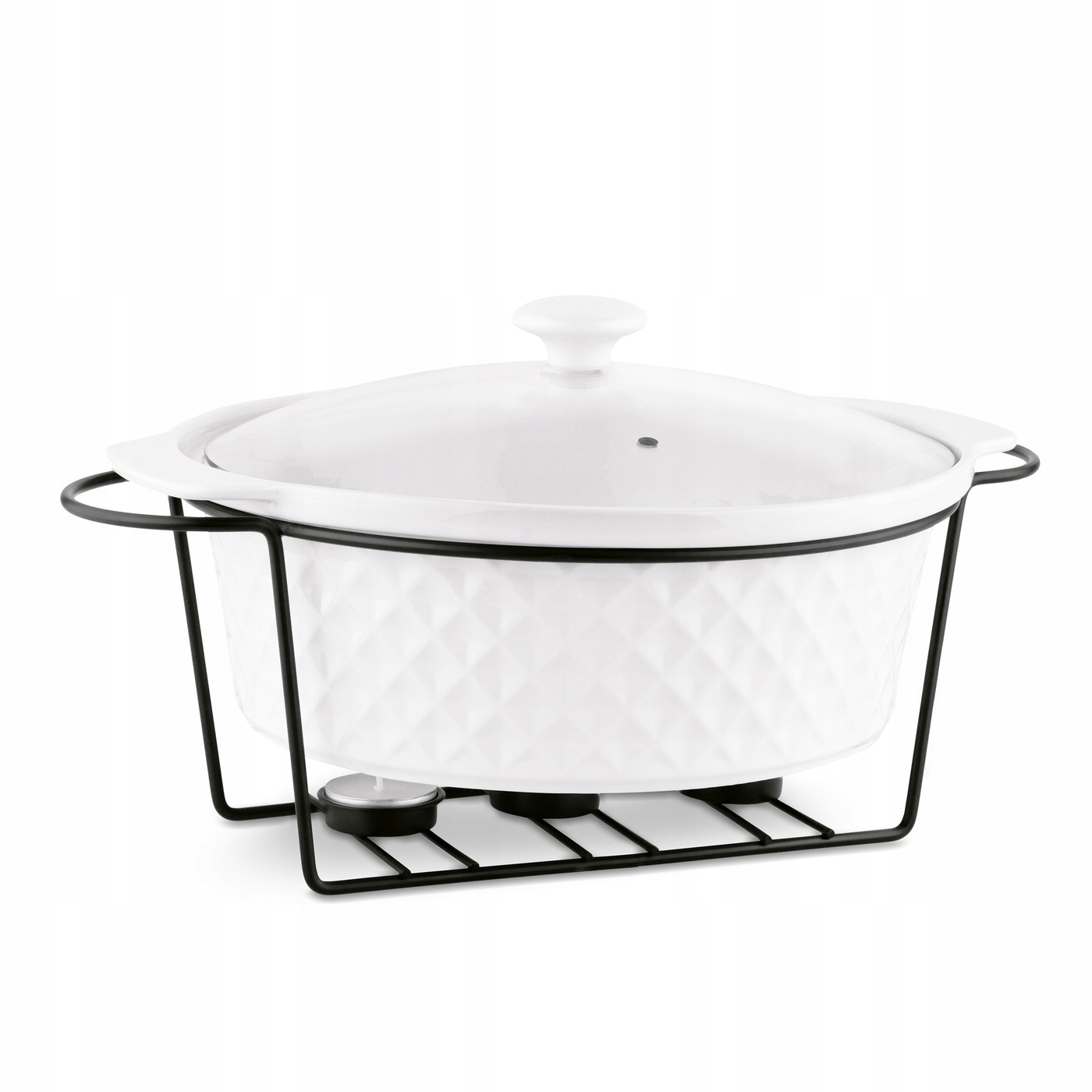 Белый сосуд на обогревателе Diamond 3,5 -литрового нагревателя Konghoffer является круглым и фарфором. Его мощность будет соответствовать семейным блюдам. Вы можете подавать домашние блюда на столе при каждой возможности. Более того, вы заставите еду подавать долгое время. Это возможно путем размещения свечей с шипами в нужных местах прикрепленной металлической порошковой стойки в черном. Вы можете безопасно вымыть фарфоровое блюдо для подачи блюд в посудомоечной машине. Набор также включает в себя стеклянную крышку с керамической ручкой. Это поможет вам в эффективном нагреве таких поданных ингредиентов, соусов и ужина. Кроме того, вы можете стабильной пищи на столе, не беспокоясь о повреждении столешницы. Вы также будете безопасно и комфортно переместить все это. Просто помните, что алмазное сосуд не должен подвергаться внезапным изменениям температуры. Его максимальная тепловая прочность - 140 Цельсия.