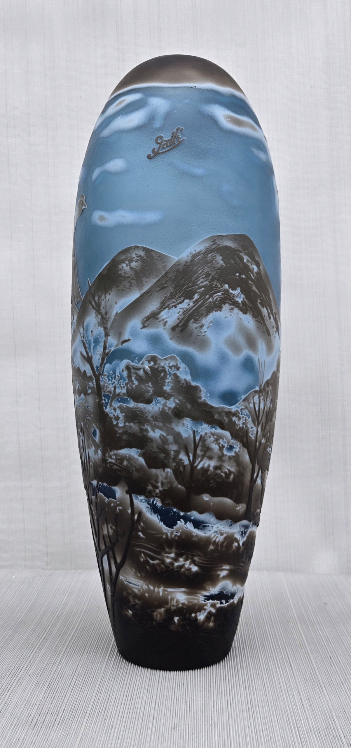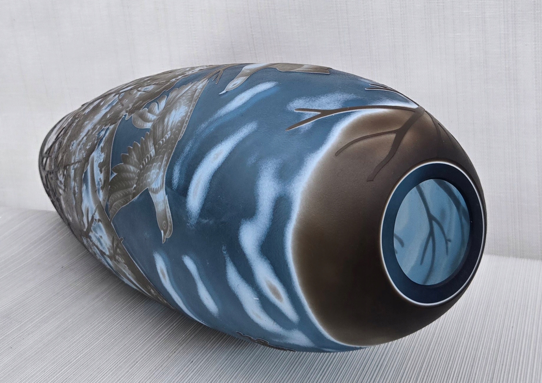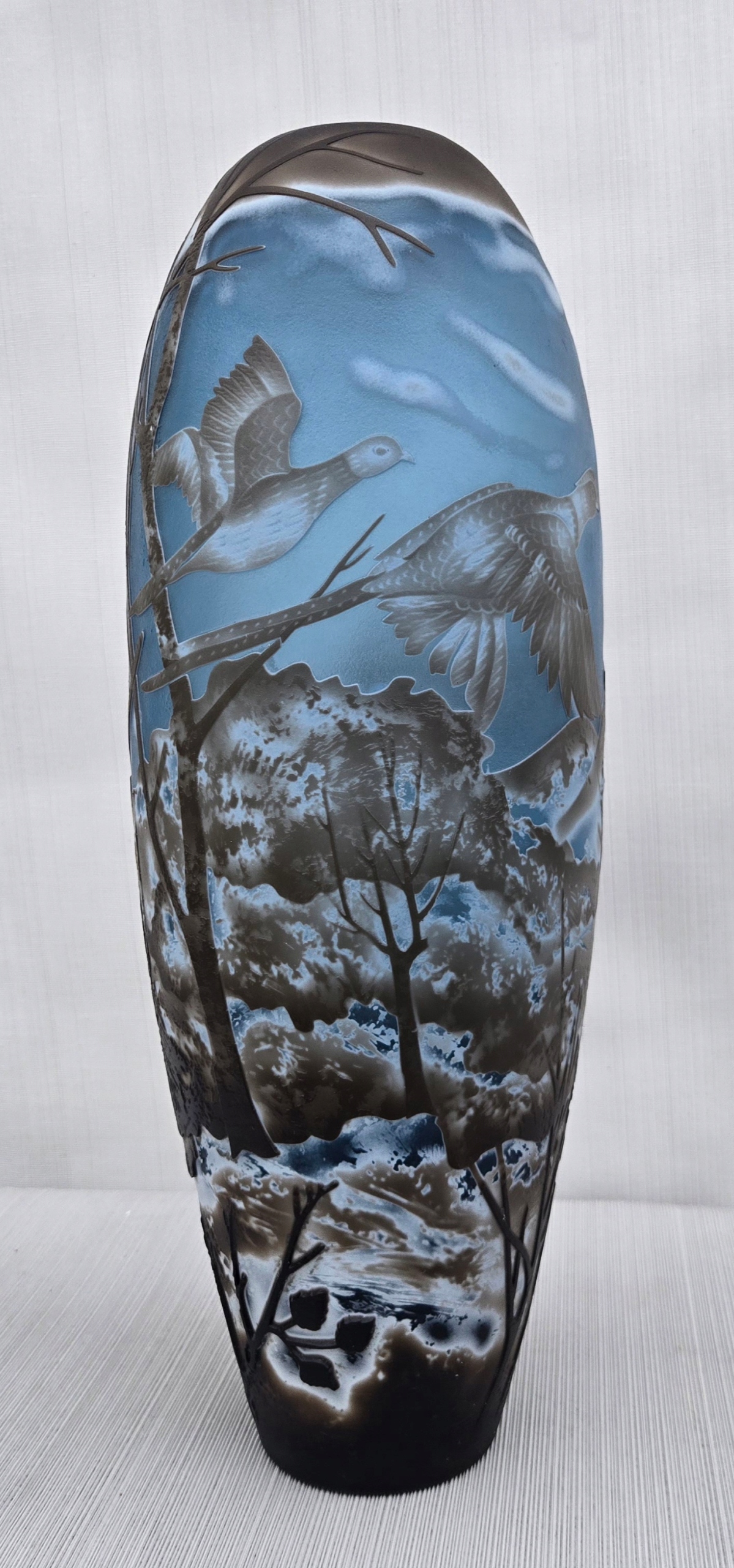Этот уникальный объект изготовлен из высококачественного стекла, а его поверхность украшена сложной гравированной сценой, изображающей птиц в полете на фоне ландшафта.