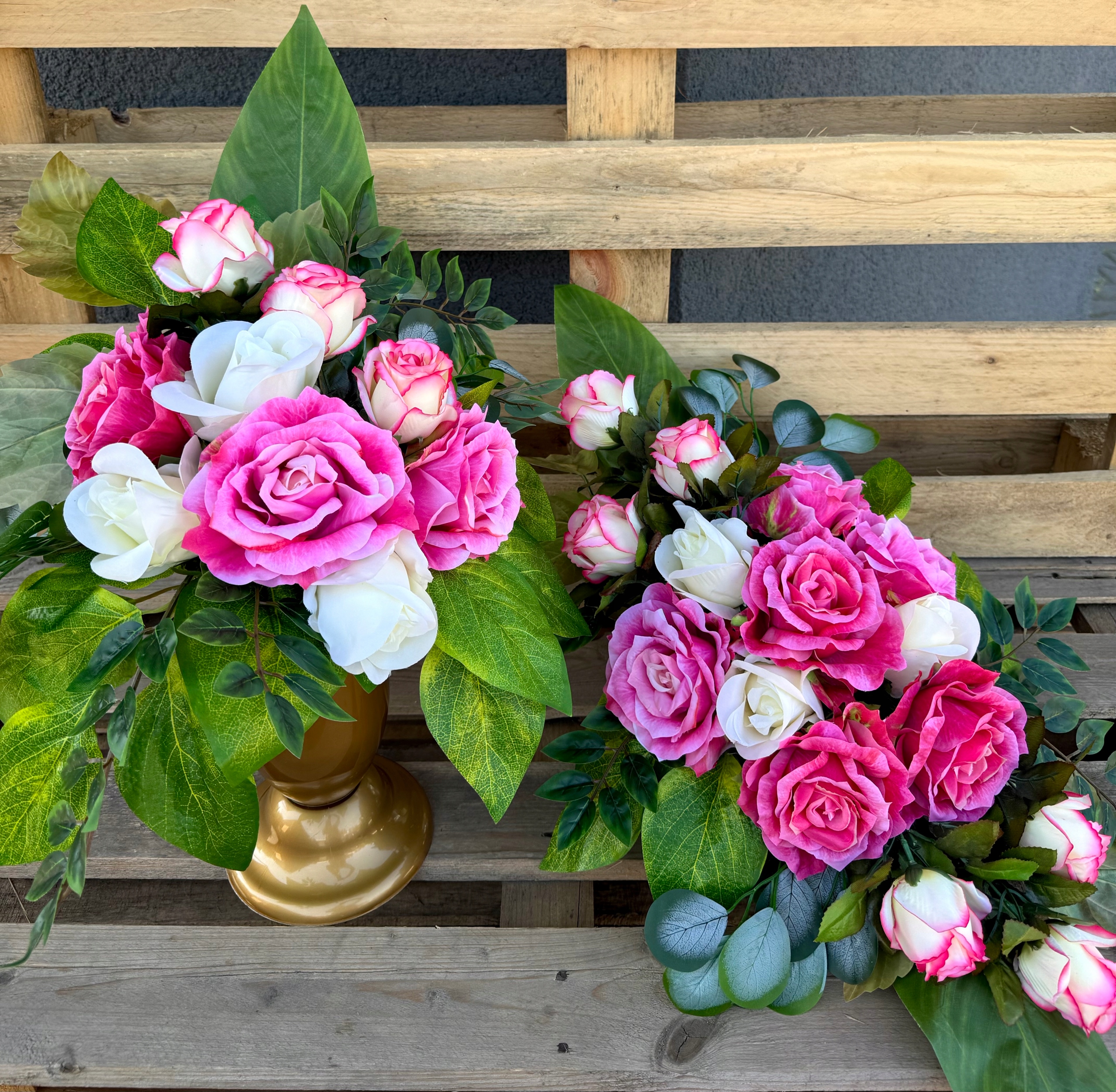 Уникальный надгробный набор в оттенках розового и экрю с богатой окантовкой зеленых аксессуаров: букет + букет.