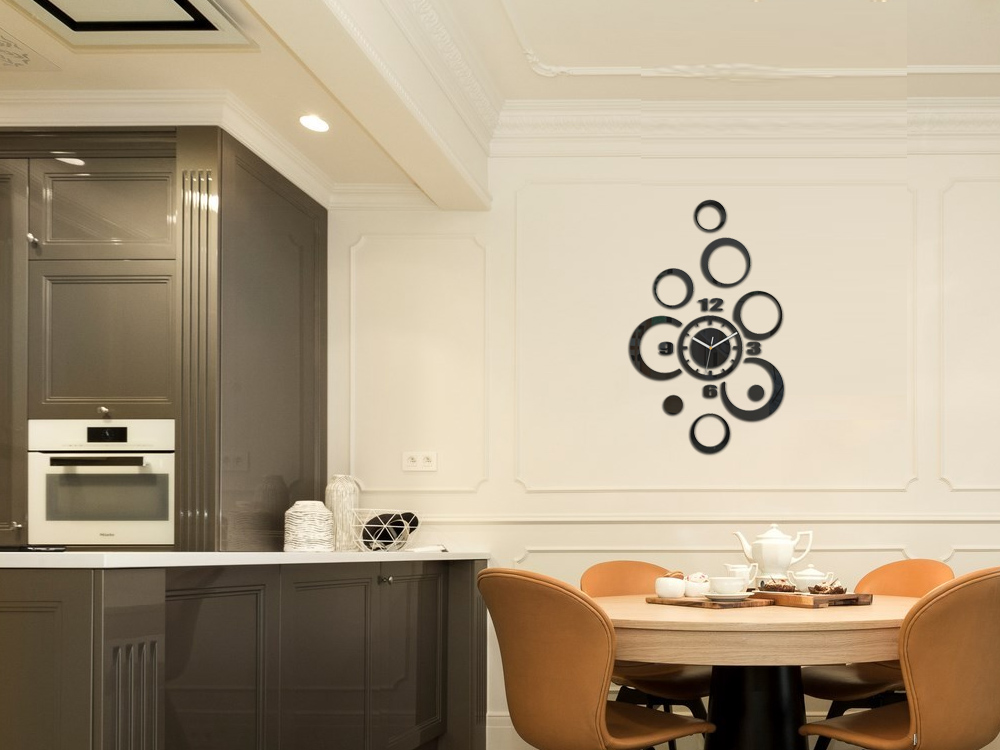 <ул>Часы собираются быстро и удобно. Циферблат со стрелками можно закрепить на крючке. Декоративные элементы крепятся к стене с помощью монтажного скотча. Каждый элемент проклеен скотчем. У часов есть шаблон — благодаря ему можно точно расположить элементы на стене.