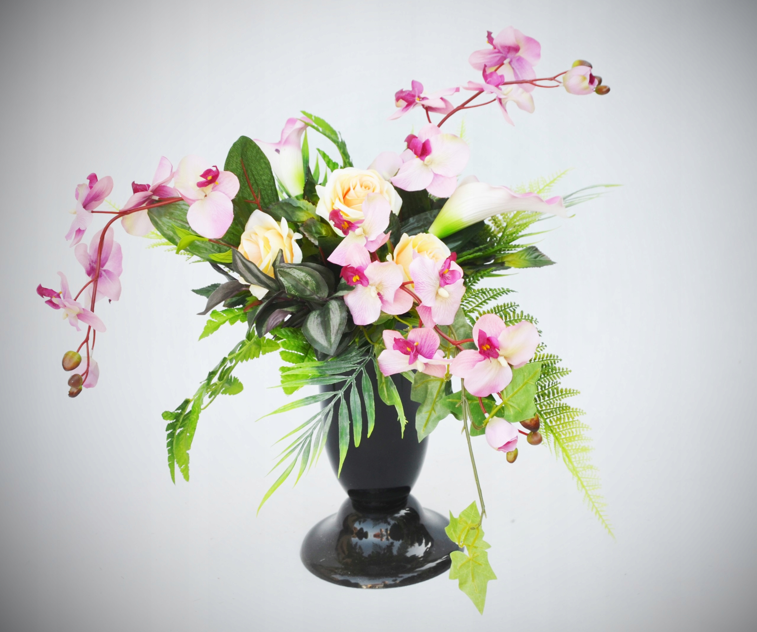 Большой, богатый, красивый букет на могилу, сделанный из высококачественных искусственных цветочных аксессуаров, которые красиво смотрятся.