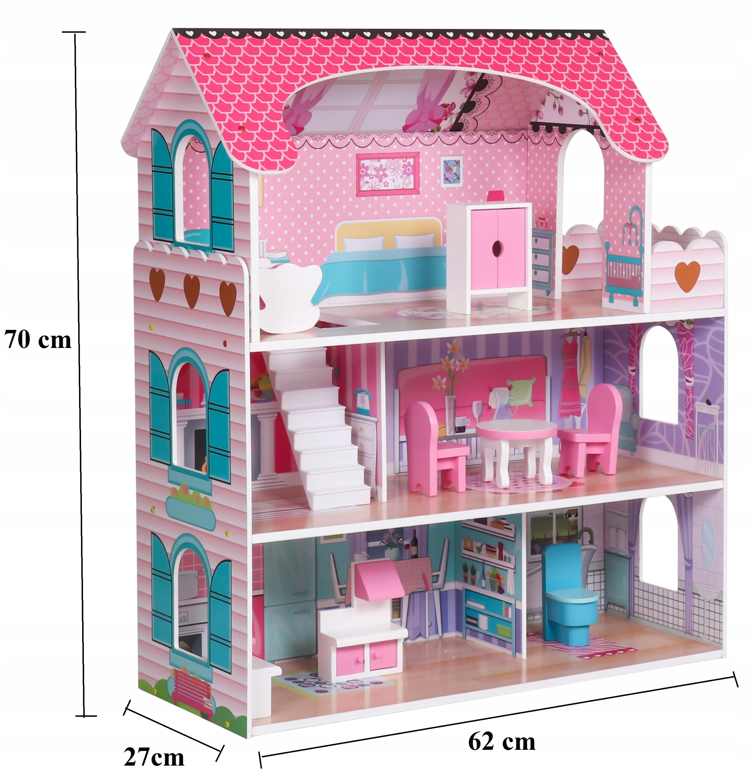 Красивый трехэтажный деревянный кукольный домик с мебелью и террасой был сделан с большим вниманием к каждой детали. Он имеет 5 больших и пространственных комнат и ходит на террасу. Деревянная мебель и аксессуары подвижны и могут перемещаться в любом месте в зависимости от воображения ребенка. Коттедж имеет три независимых уровня, в общей сложности 5 номеров + терраса, и каждая из них хранится в другом стиле (спальня, столовая, кухня, ванная комната, гостиная). Это, безусловно, будет наслаждаться вашим ребенком и обеспечить долгие часы веселья. Дом совершенно безопасен и стабилен. Он идеально подходит для любого интерьера