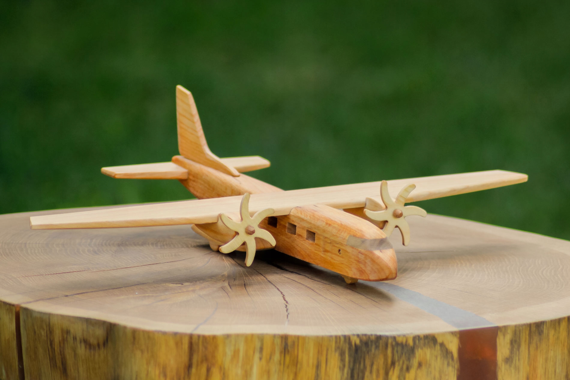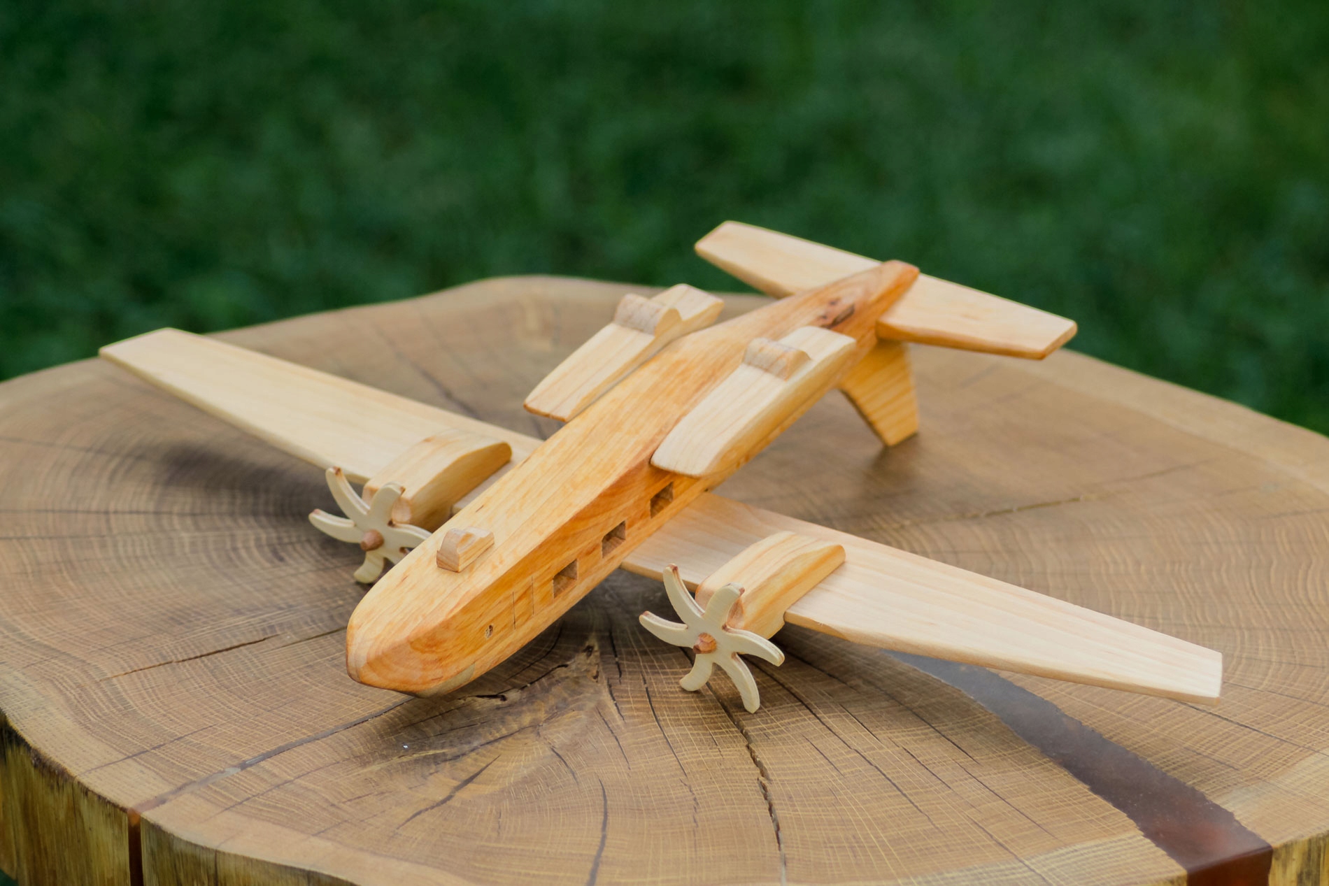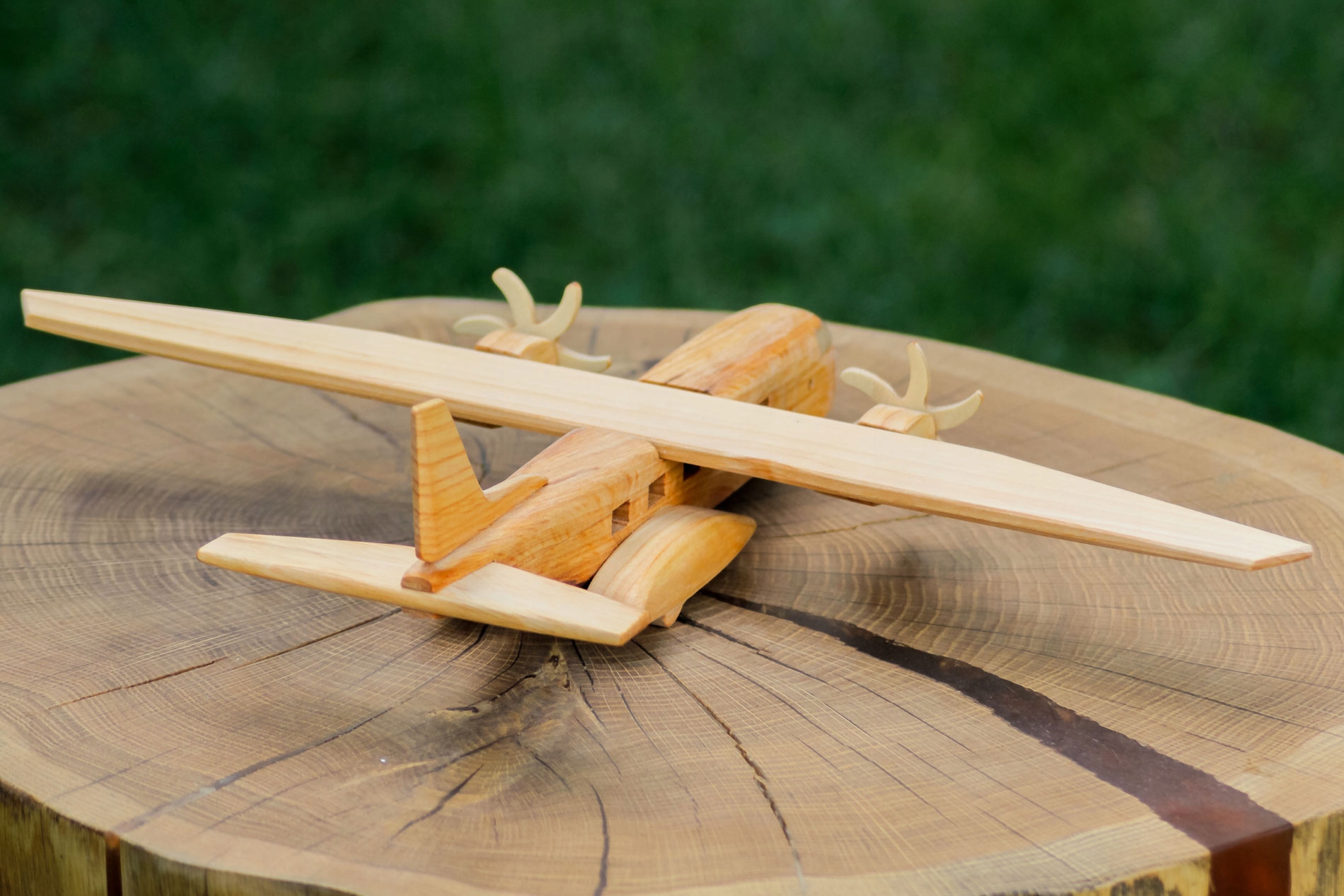Самолет окрашен натуральным льняным маслом - защищает от загрязнений, сохраняет и усиливает текстуру древесины.