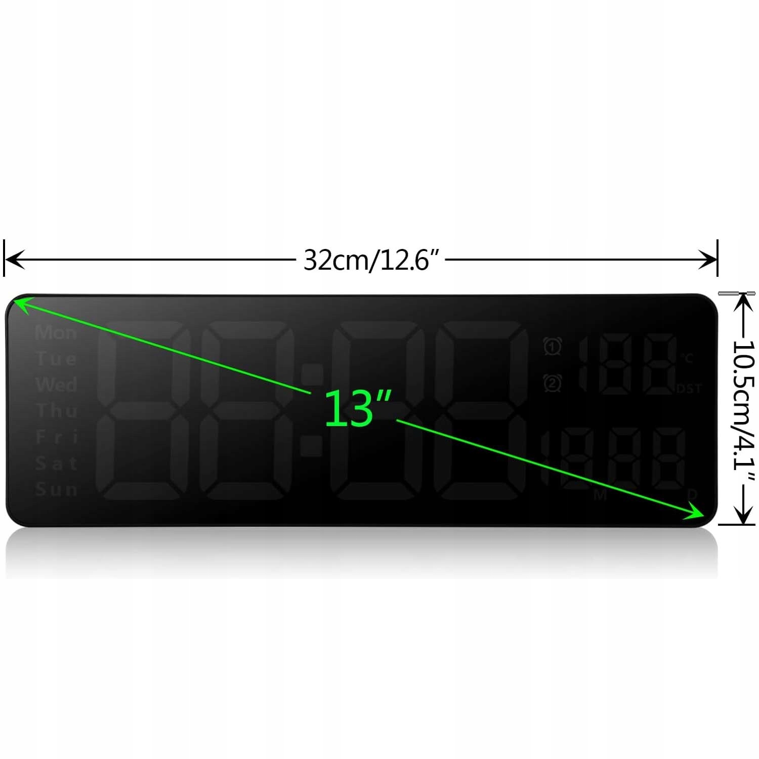Цифровые часы имеют 13-дюймовый дисплей и в то же время отображают время, дату, день недели и температуру. Если вы живете в районе, где применяется летнее время, длинное нажатие кнопки «-» автоматически прыгает вперед/назад, и в то же время отображаются/выключены иконки «DST».