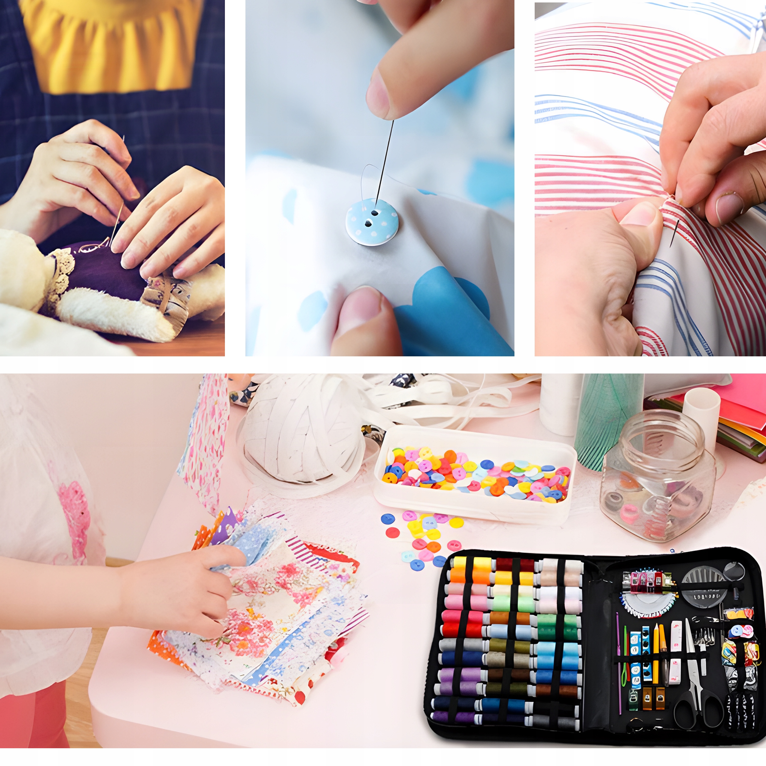 — можно пришить пуговицу, зашить дырку или починить шов в любимой рубашке. Вы сможете оперативно привести одежду в нужное состояние, не посещая портного, а различные инструменты позволяют работать с материалами разной толщины и структуры. Каждый элемент создан для того, чтобы работа была быстрой, точной и комфортной. Благодаря этому набору даже сложный ремонт становится легким и приятным.