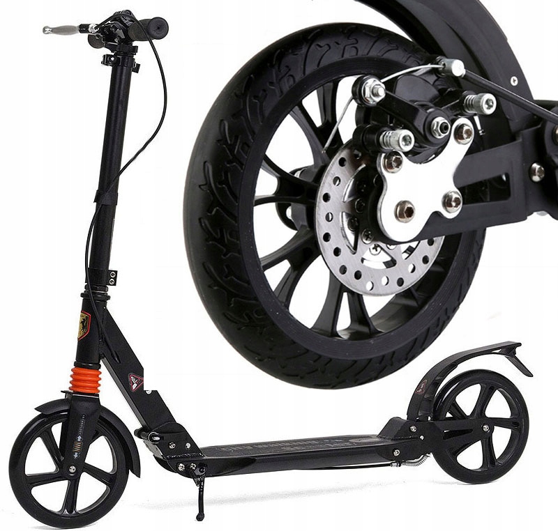 Большой и прочный 2-колесный скутер с дисковым тормозом b> и амортизаторами b>, предназначенными для детей и взрослых. Изготовлен из прочного алюминия, максимальный вес пользователя до 100 кг.
