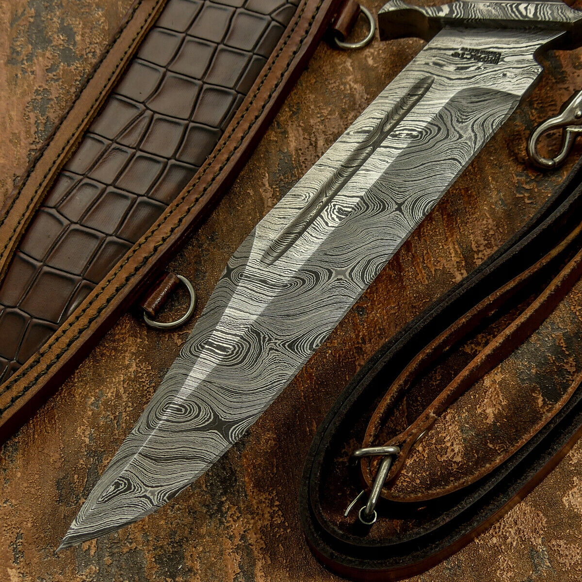 Новый красивый большой нож Боуи ручной работы от бренда Impact Custom Knife, изготовленный из культовой дамасской стали по мотивам ножа из фильма Рэмбо III. Отлично подходит в качестве охотничьего, туристического, походного и тактического ножа. DM 521