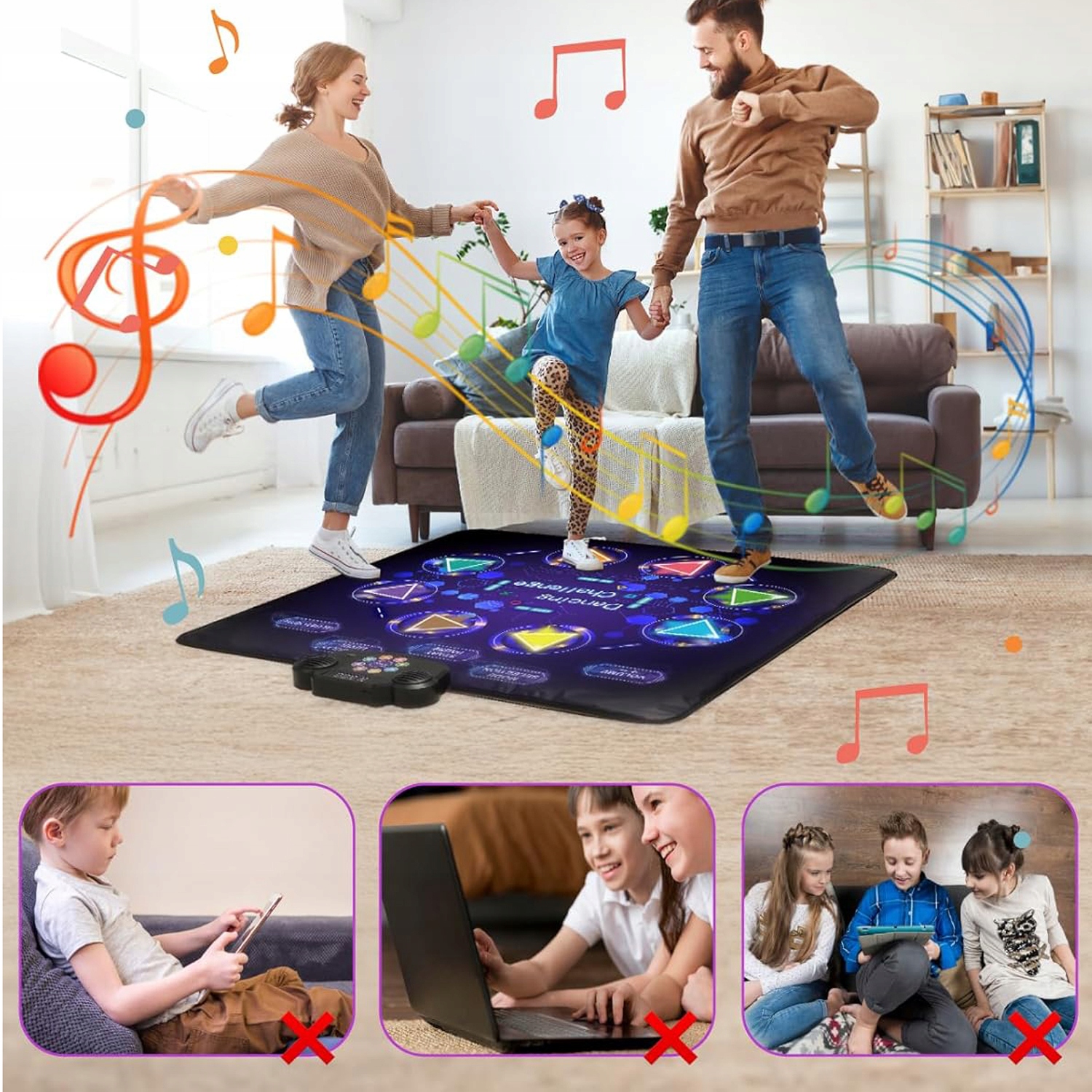 🎶🎶【Чрезвычайно практично】Поверхность танцевального коврика изготовлена из водонепроницаемого материала PE и OPP, нетоксичного и легко чистящегося; дно изготовлено из нескользящего материала PEVA, чтобы обеспечить устойчивость танцевального коврика для детей от 4 лет, чтобы дети могли безопасно танцевать и получать удовольствие. Размеры музыкального коврика 100 х 99 см, одеяло можно свободно складывать для удобства хранения и транспортировки.