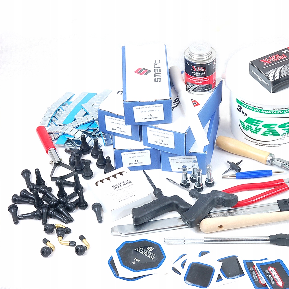 Стартовый набор для людей, занимающихся ремонтом шин, включая все необходимое для ремонта шины/камеры и балансировки колеса.