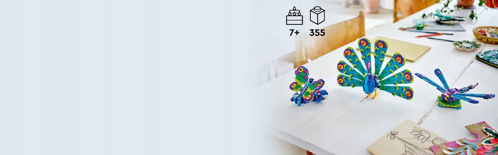 Набор LEGO Creator 3 в 1 позволяет создать красивого экзотического павлина с яркими раскидистыми перьями, нежную стрекозу