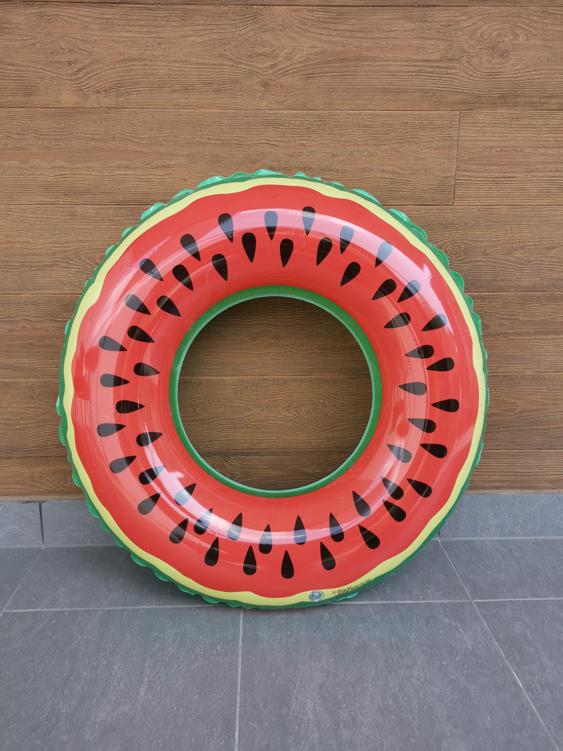 Красочное надувное кольцо в форме арбуза, изготовленное из высококачественного ПВХ, гарантирующего долговечность.