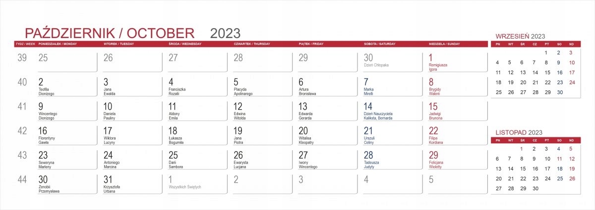 Очистить 12-страничный календарь. Четкий макет месяца с местом для заметки рядом с каждым днем, нумерацией недель и нерабочими днями, отмеченными в Польше красным. Дополнительно на каждой карточке вы найдете предварительный просмотр предыдущего и следующего месяца года с декабря 2022 по январь 2024 года. В календаре отмечены именины и праздники. Названия месяцев и дней недели в основном календаре также даны на английском языке.