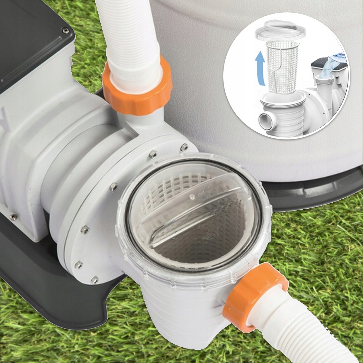 Фильтр-насос имеет верхний корпус, поворачивающийся на 360°, что позволяет подсоединять шланги подачи и слива воды под любым углом. Кроме того, устройство оснащено манометром, позволяющим проверить безопасность его работы, а также видоискателем сита, задерживающего более крупные отходы. Встроенные часы позволяют автоматически устанавливать рабочее время.