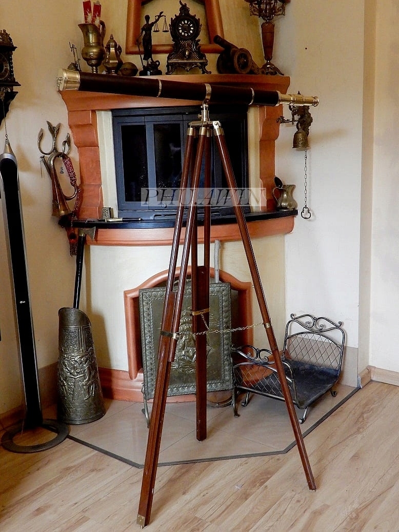 Труба телескопа обтянута кожей и инкрустирована латунными кольцами. Увеличьте в несколько раз, красивое, четкое изображение. Деревянный штатив, отделка латунь