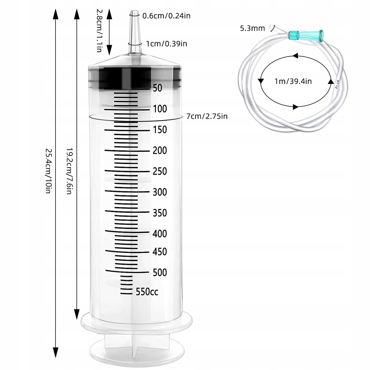 ◾Черный колпачок на этом пластиковом шприце обеспечивает плотное прилегание, входящий в комплект прозрачный шланг длиной 1 метр можно легко отрезать до нужной длины, а адаптер иглы предотвращает утечку. Шкала шприца большая и легко читаемая, что обеспечивает точное дозирование.