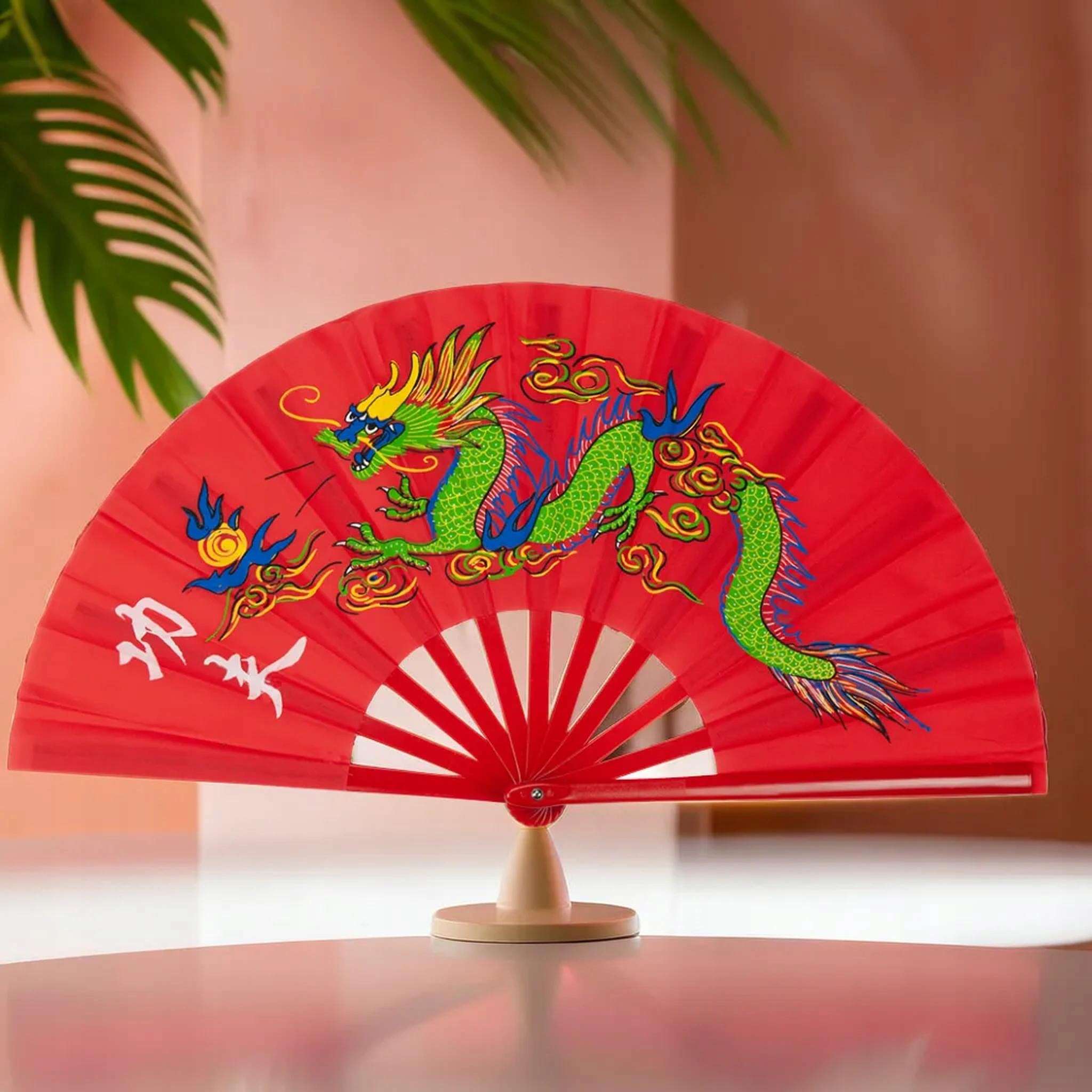 Откройте для себя наш большой красный складной веер, украшенный традиционным китайским мотивом дракона. Этот веер - не только практичный аксессуар для занятий спортом и танцами, но и декоративный элемент для праздников и праздников.