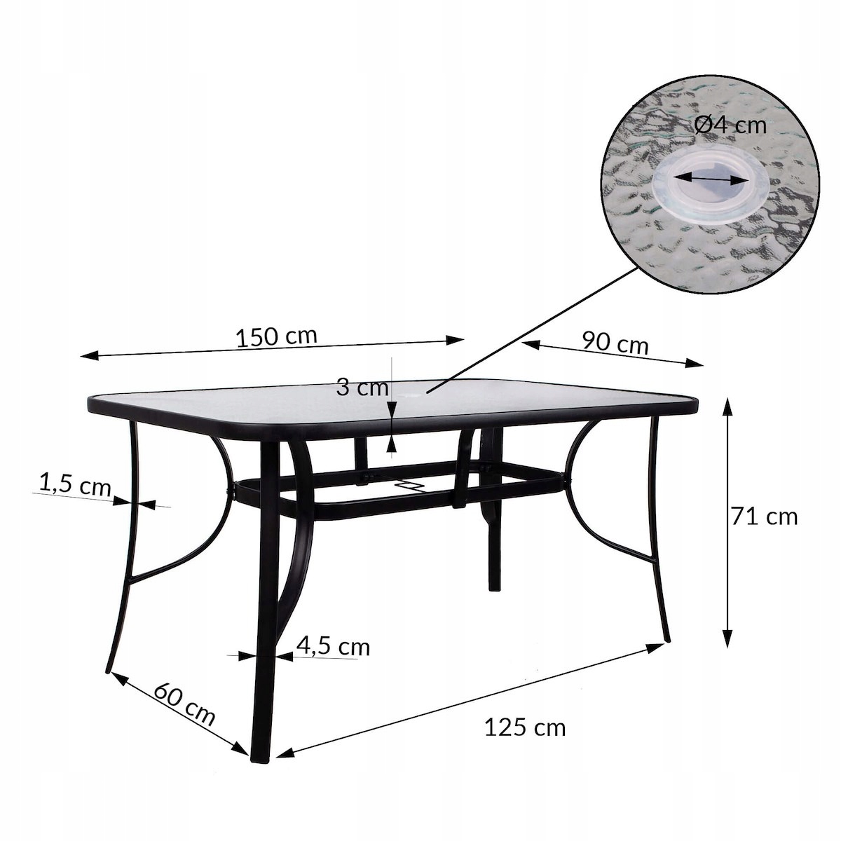 - Диаметр отверстия для зонта: 4 см.