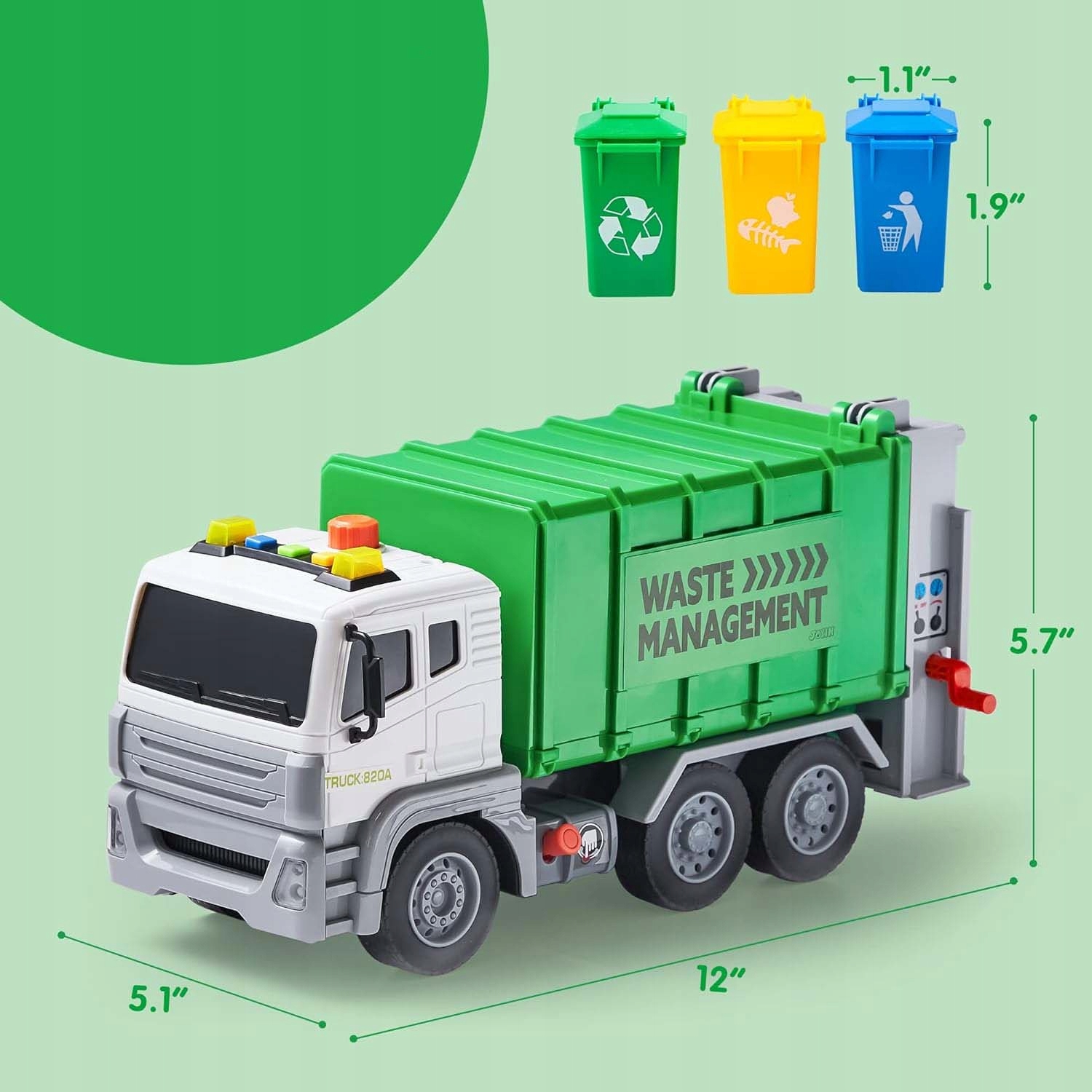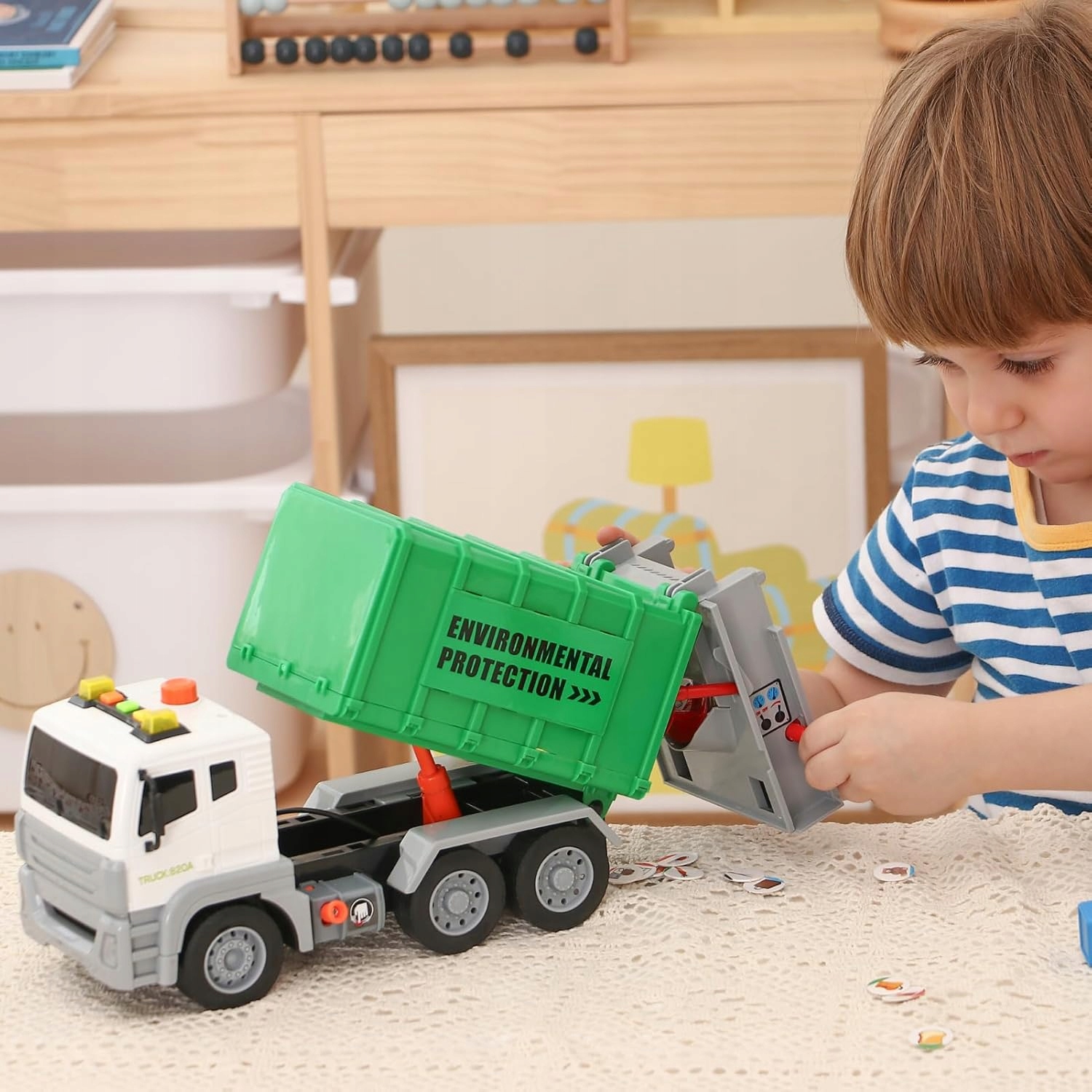 Этот игрушечный грузовик работает как настоящий мусорный грузовик. На обратной части вы можете повесить мусорное ведро, а качание можно использовать для бросания «мусора». Колеса питаются шипами. Дети могут переместить грузовик в другое место, а затем выбрасывать «мусор», поднимая заднюю часть грузовика. Реалистичные звуки и огни обеспечивают больше удовольствия от детей