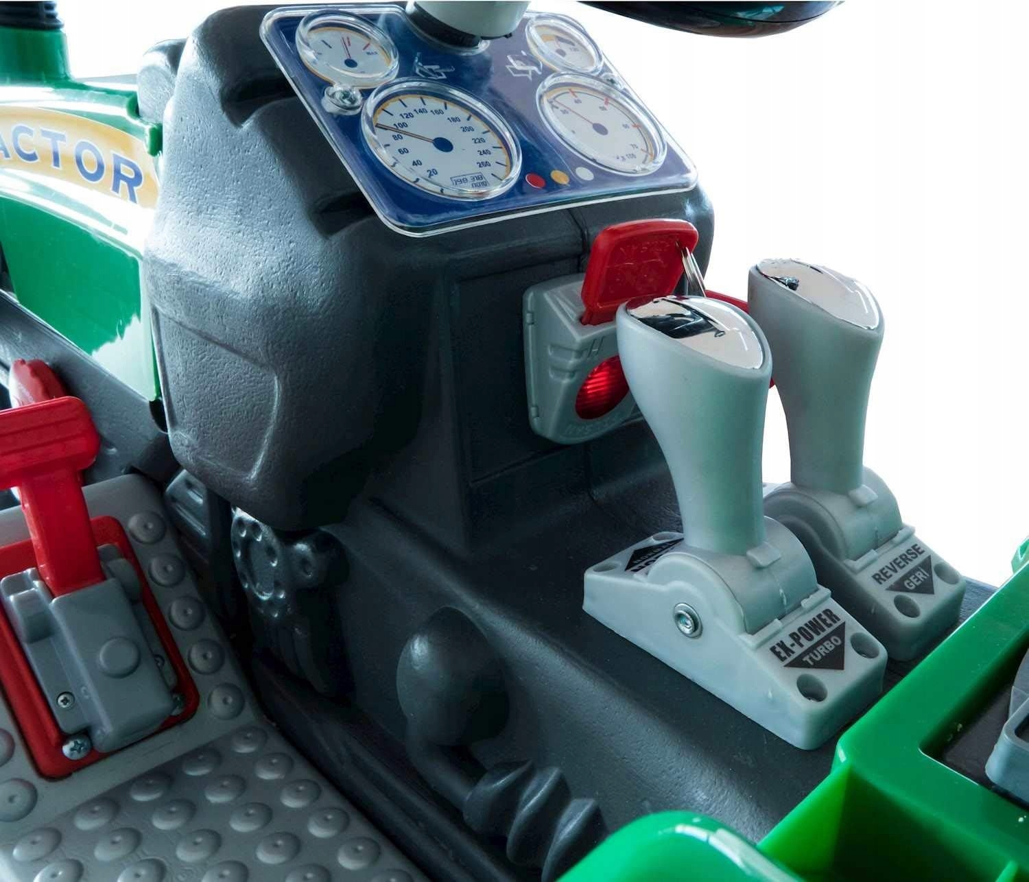 Трактор оснащен автоматическим тормозом , который активируется после удаления ноги из газа, и светящиеся передние светильники , добавляя реализм для игры. Рычаг передачи позволяет двигаться вперед и назад, и Панель управления с рогом позволяет дополнительные достопримечательности. Открывающий передний клапан и towbar пробудить воображение маленького водителя.