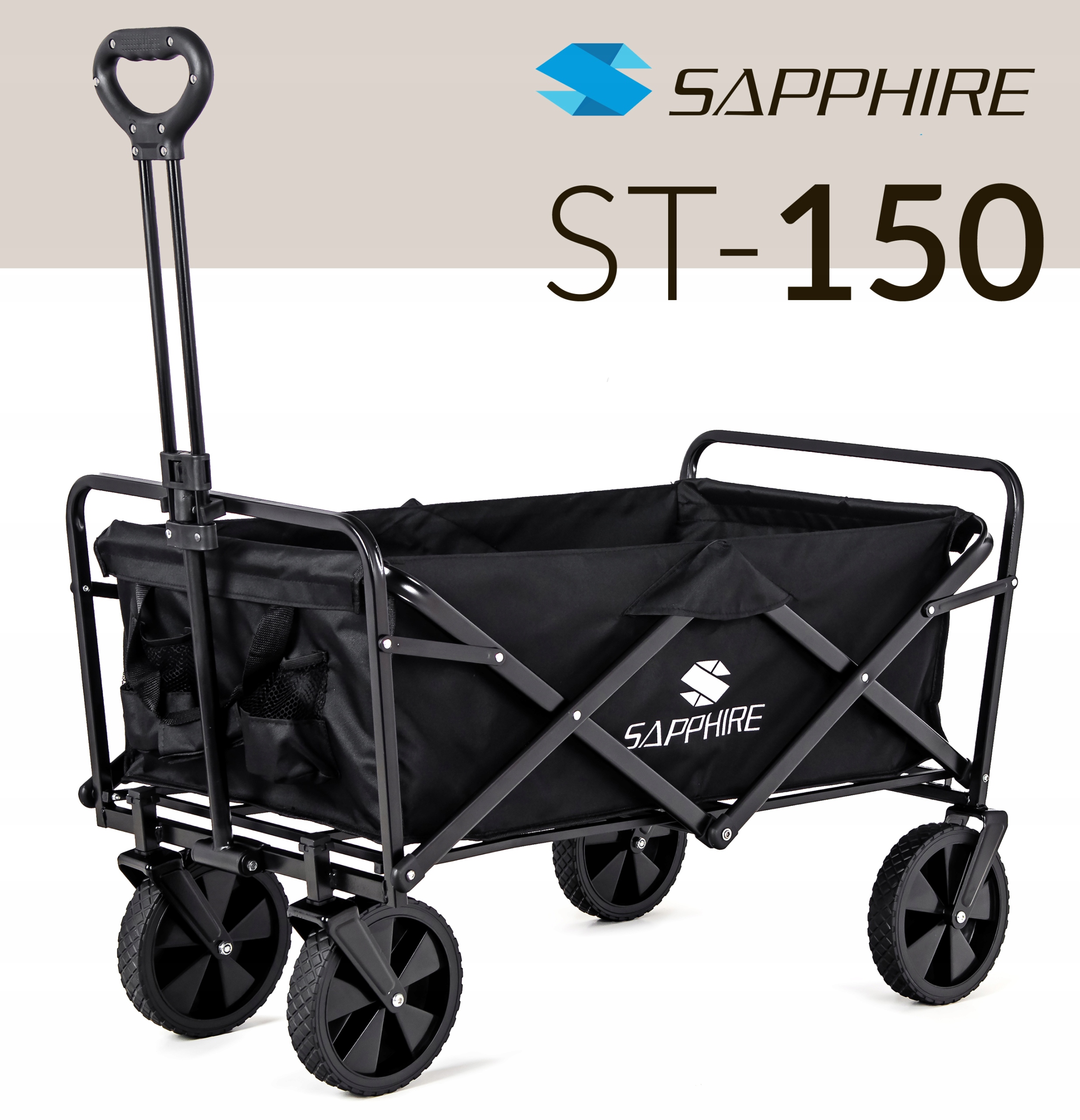 Представляем Вам новинку в предложении компании Сапфир - Туристическая тележка СТ-150. Наша тележка имеет легко складывающуюся конструкцию. рамку, что облегчает ее хранение. В сложенном виде коляска занимает мало места, поэтому ее можно легко перевозить в багажнике автомобиля.