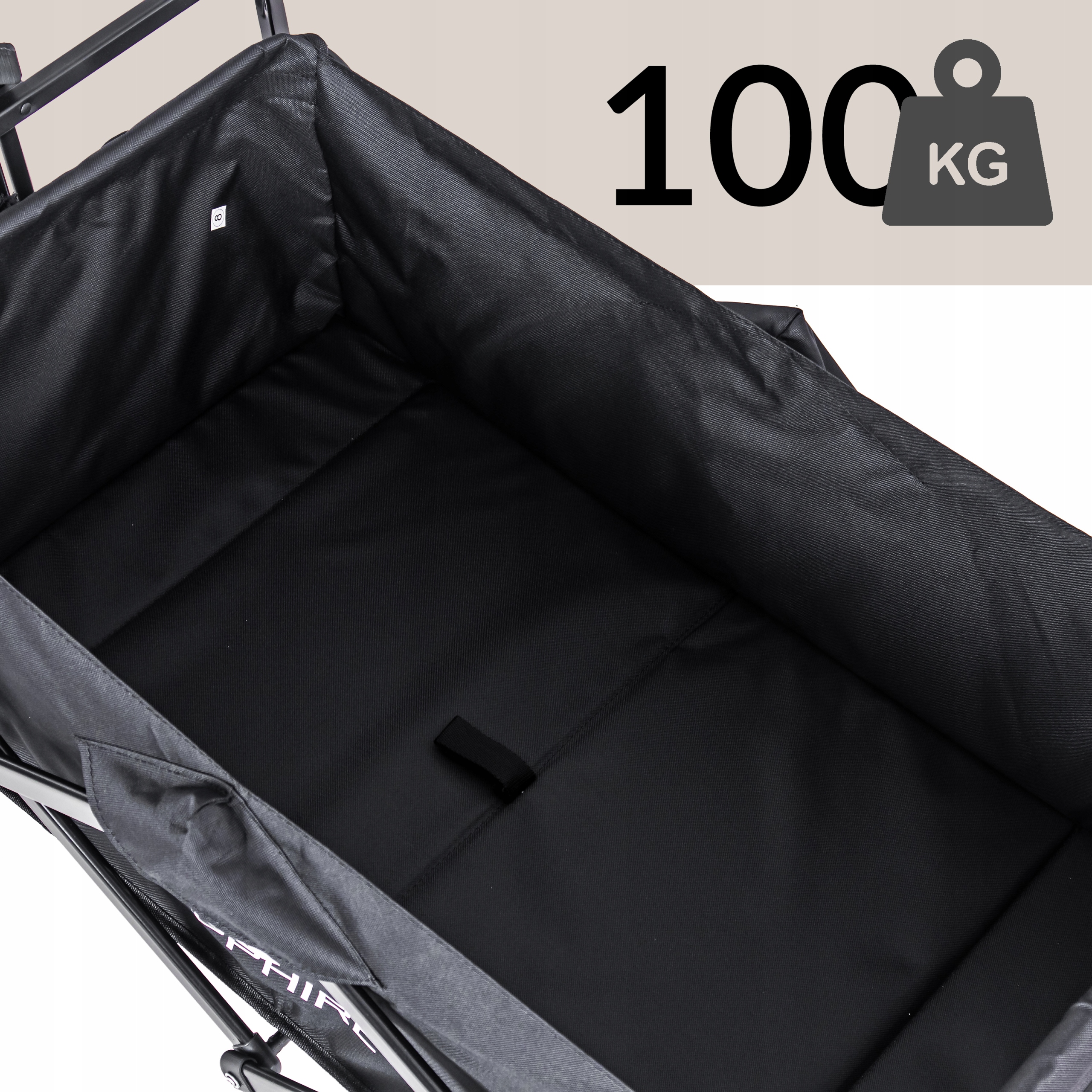 - Благодаря прочной металлической конструкции и использованию очень прочного материала, который покрыт водонепроницаемым полиэстером 600D, коляска Сапфир имеет грузоподъемность до 100 кг. Дополнительным преимуществом является усиленное дно транспортировочной поверхности.