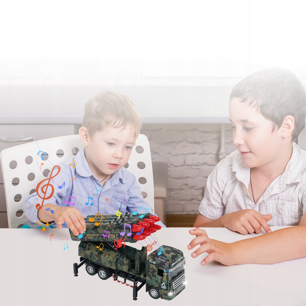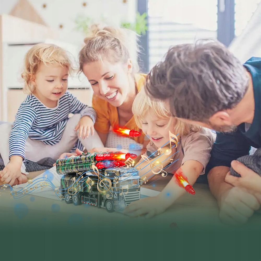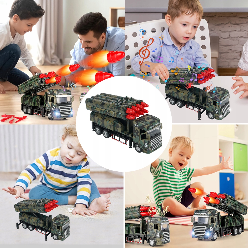 Эта игрушечная военная машина оснащена 16 ракетами, которые можно заряжать, выгружать и запускать. Башню можно поднимать и опускать на 45 градусов.
