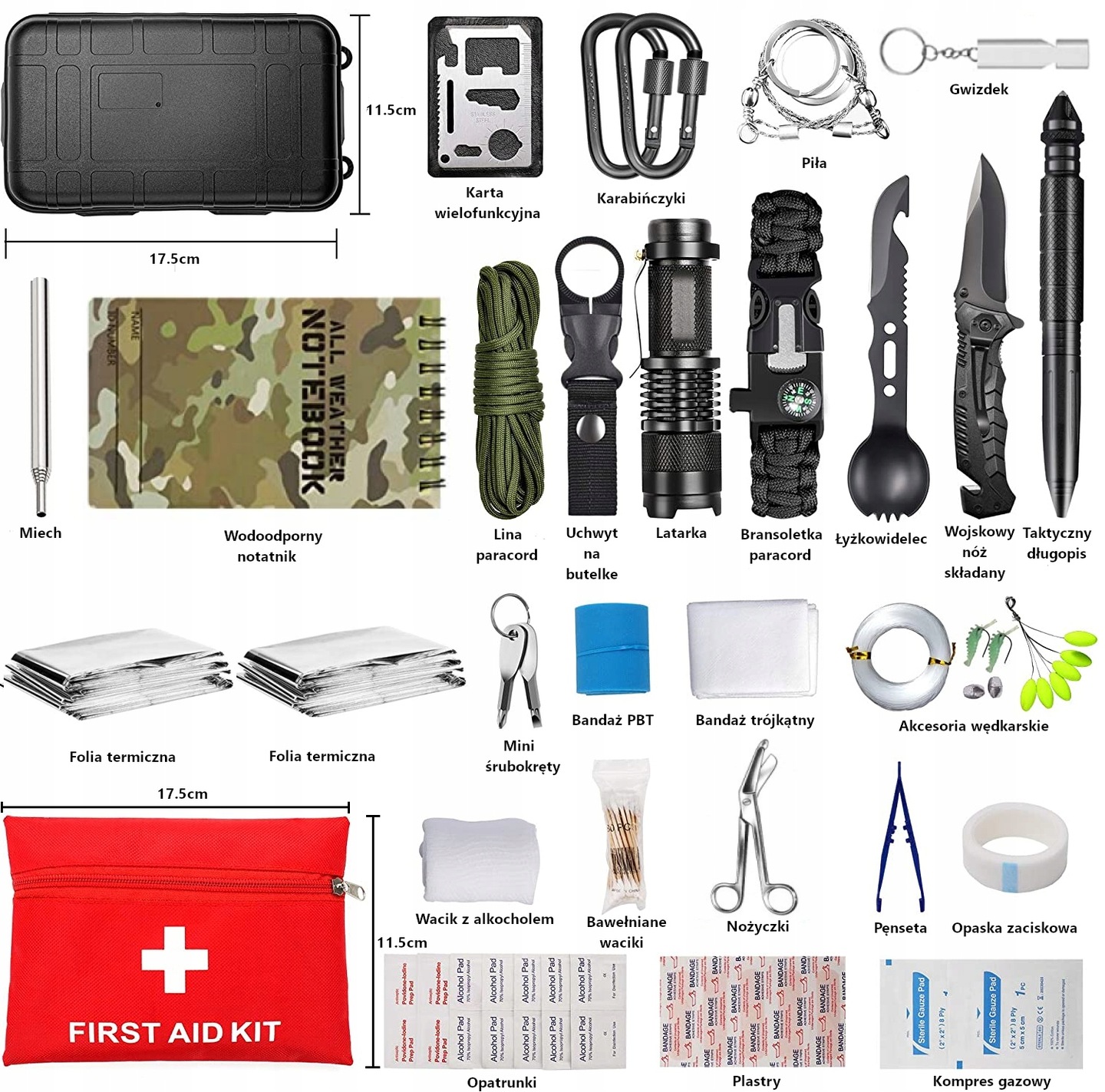 Набор для выживания содержит 34 предмета, которые стоит взять с собой в путешествие, поездку, поход, выживание или в качестве EDC в рюкзаке или машине.